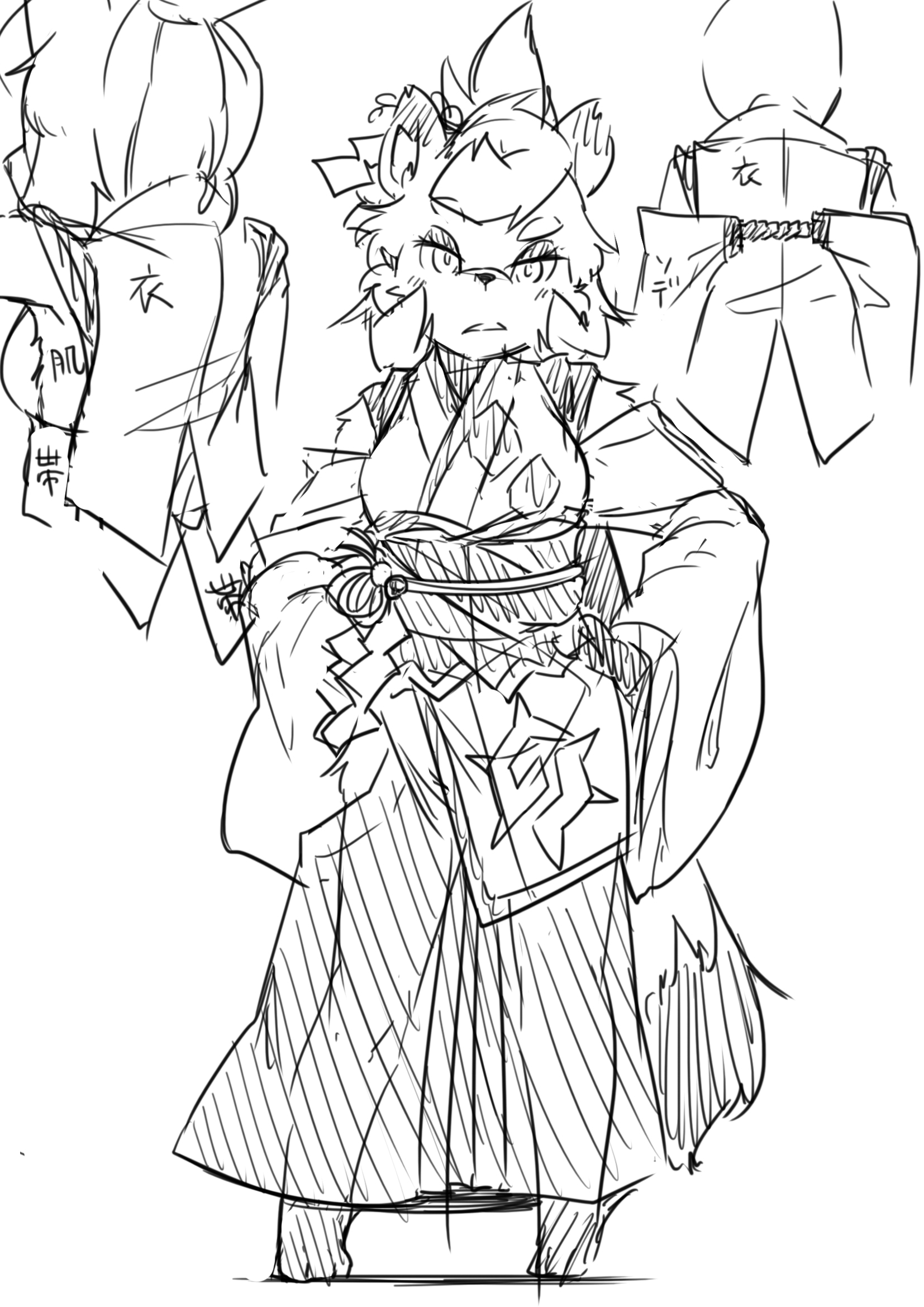 1girl animal_ear_fluff animal_ears animal_nose bare_shoulders barefoot breasts detached_sleeves female_focus from_behind full_body furry furry_female greyscale hair_ornament hakama hakama_skirt half-closed_eyes hands_on_own_hips highres japanese_clothes japanese_text kame_(3t) kimono long_sleeves looking_at_viewer medium_breasts miko monochrome multiple_views obi original parted_lips raccoon_ears raccoon_girl raccoon_tail rin-chan_(kame_(3t)) sash see-through_clothes shide short_hair simple_background sketch skirt sleeveless sleeveless_kimono split_mouth standing straight-on swept_bangs tail topknot translation_request upper_body white_background wide_sleeves