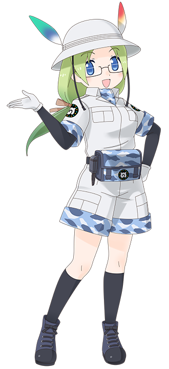 1girl blue_eyes glasses green_hair hat hat_feather kemono_friends kemono_friends_3 looking_at_viewer mirai_(kemono_friends) official_art tachi-e transparent_background yoshizaki_mine_(style)