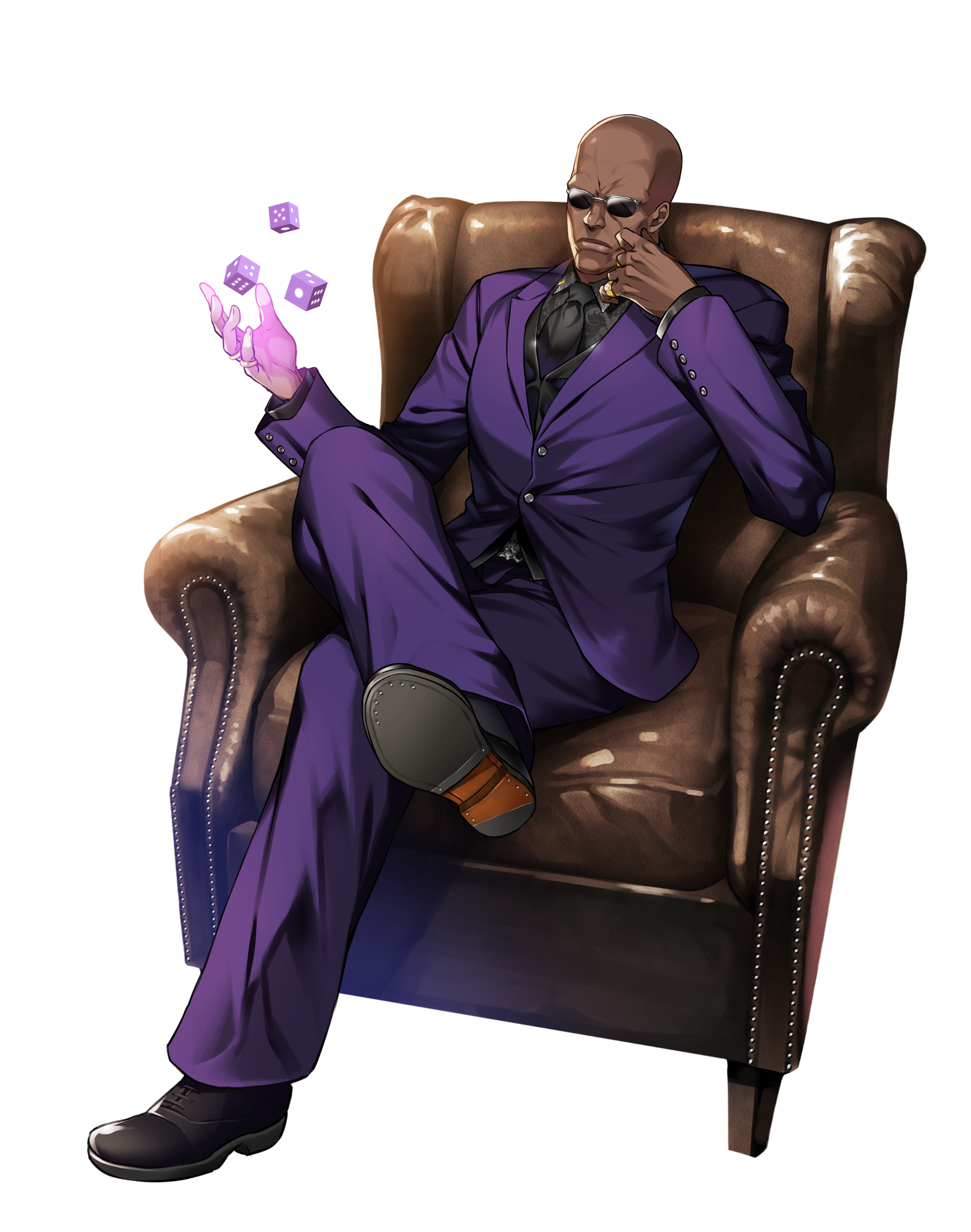 1boy absurdres bald black_footwear counter:side crossed_legs dark-skinned_male dark_skin dice dominic_king_reginald floating floating_object formal_clothes full_body highres jewelry male_focus necktie pants purple_suit replacer_king ring sitting suit sunglasses transparent_background