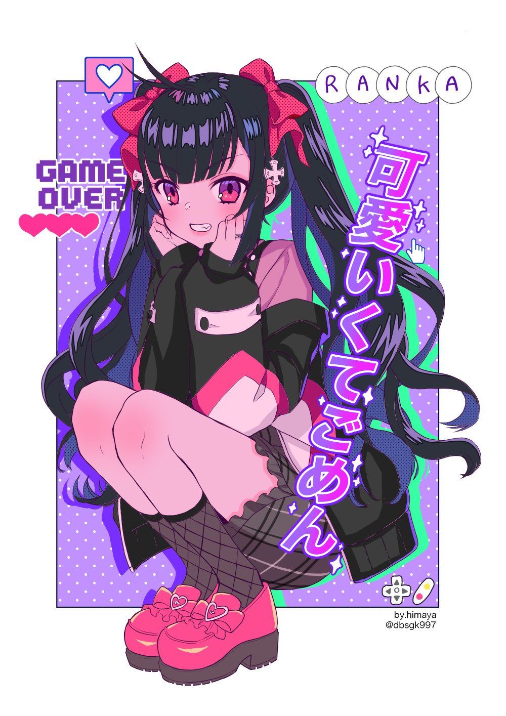 1girl ahoge black_hair black_jacket black_socks blunt_bangs border bow character_name chizu_ranka chizu_ranka_(winter_costume) clenched_teeth d-pad d-pad_hair_ornament fishnet_socks fishnets footwear_bow frilled_skirt frills full_body grey_skirt grin hair_bow hair_ornament hands_on_own_face heart highres himaya jacket jewelry lipstick long_hair long_sleeves magia_record:_mahou_shoujo_madoka_magica_gaiden mahou_shoujo_madoka_magica makeup miniskirt mixed-language_text official_alternate_costume outside_border pink_bow pink_eyes pink_shoes plaid_clothes plaid_skirt polka_dot polka_dot_background purple_background ring shoes sidelocks skirt smile socks solo sparkle spoken_heart squatting teeth twintails very_long_hair wavy_hair white_border