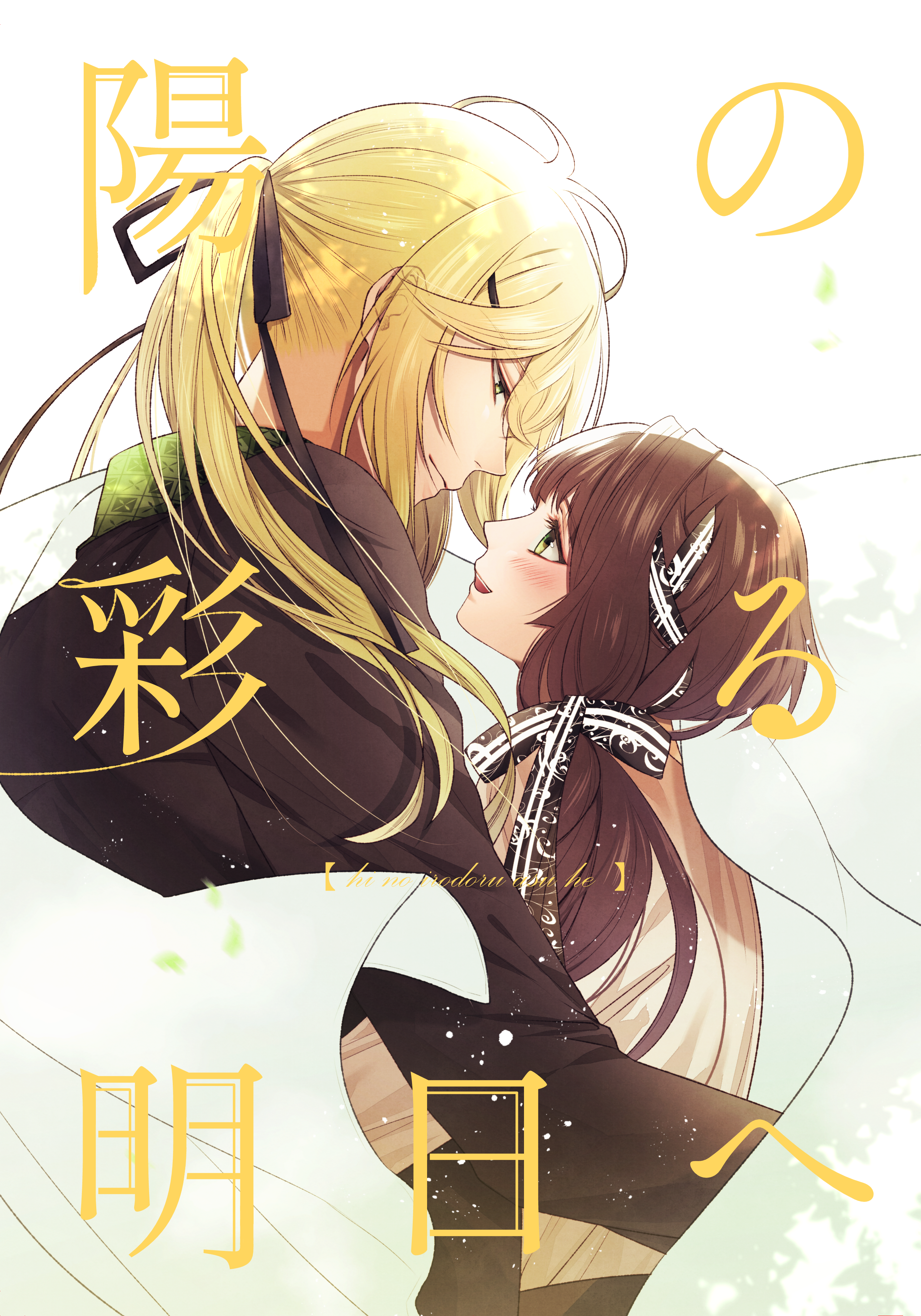 1boy 1girl absurdres blonde_hair blush brown_hair collar_x_malice green_eyes hair_ribbon hetero highres hoshino_ichika_(collar_x_malice) long_hair long_sleeves looking_at_another ponytail ribbon sakamiyaxx00 shiraishi_kageyuki translation_request white_background