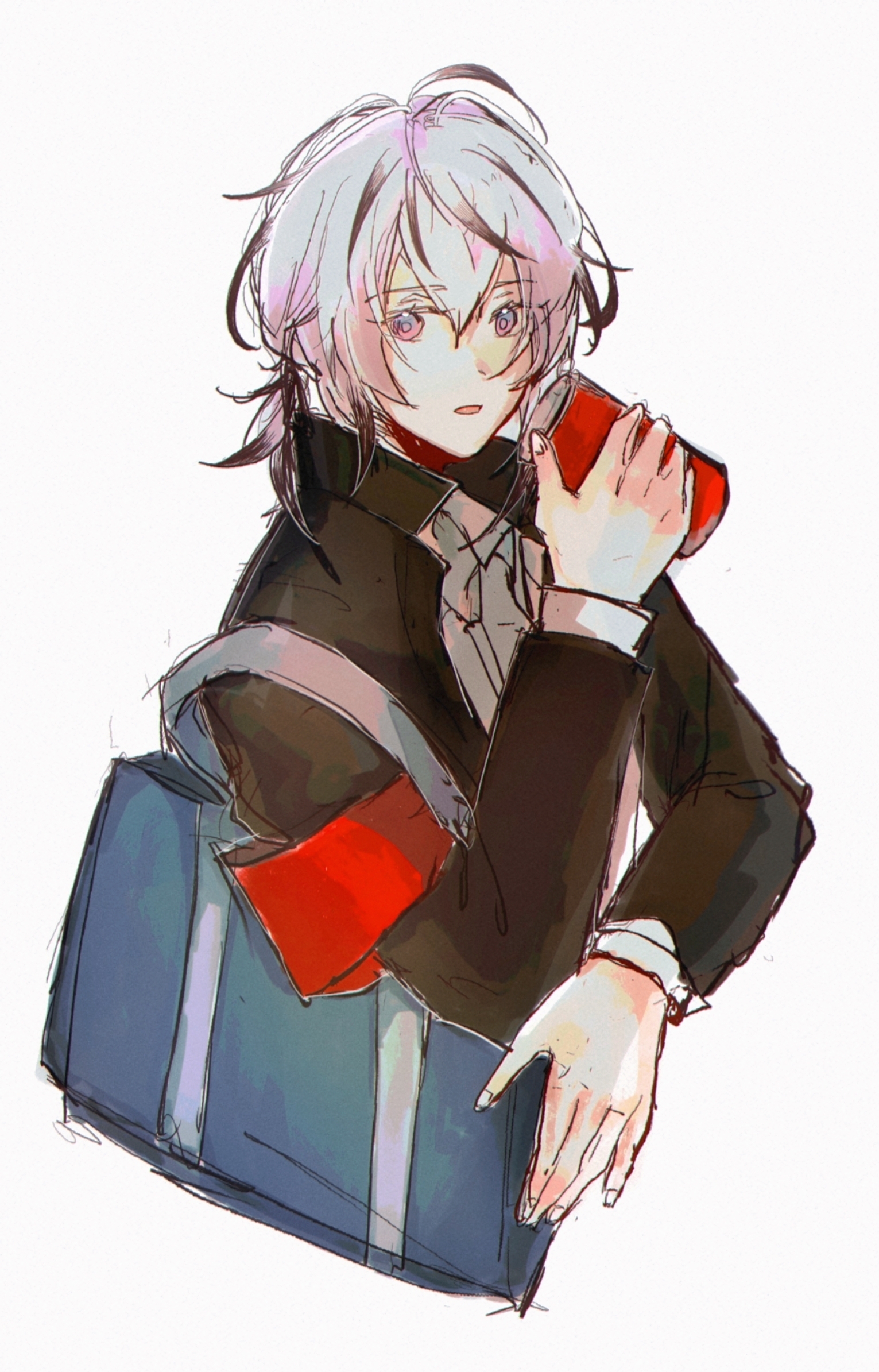 1boy armband black_jacket collar_x_malice collared_shirt grey_hair highres jacket long_sleeves looking_at_viewer male_focus okazaki_kei open_mouth purple_eyes red_armband sakura_(pixiv73541236) shirt short_hair sketch solo white_background white_hair white_shirt
