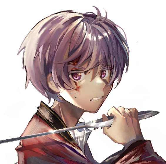 1girl antenna_hair blood blood_on_face commentary english_commentary holding kabocha1408 looking_at_viewer needle_sword parted_lips purple_eyes purple_hair short_hair solo sukuna_shinmyoumaru teeth touhou upper_body