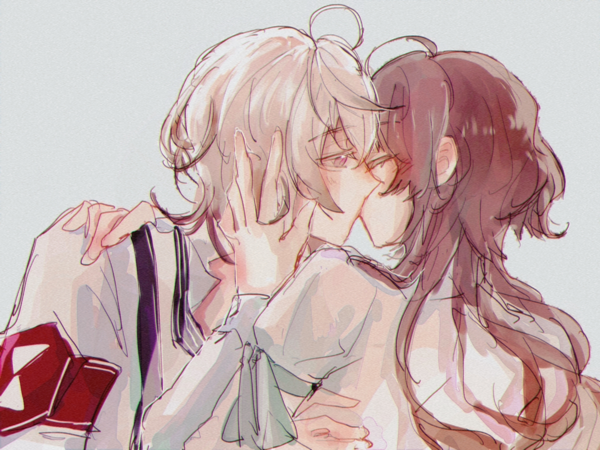 1boy 1girl blush brown_hair closed_eyes collar_x_malice facing_another grey_hair hetero highres hoshino_ichika_(collar_x_malice) kiss long_sleeves looking_at_another multicolored_hair okazaki_kei purple_eyes sakura_(pixiv73541236) shirt sketch white_background white_hair white_shirt