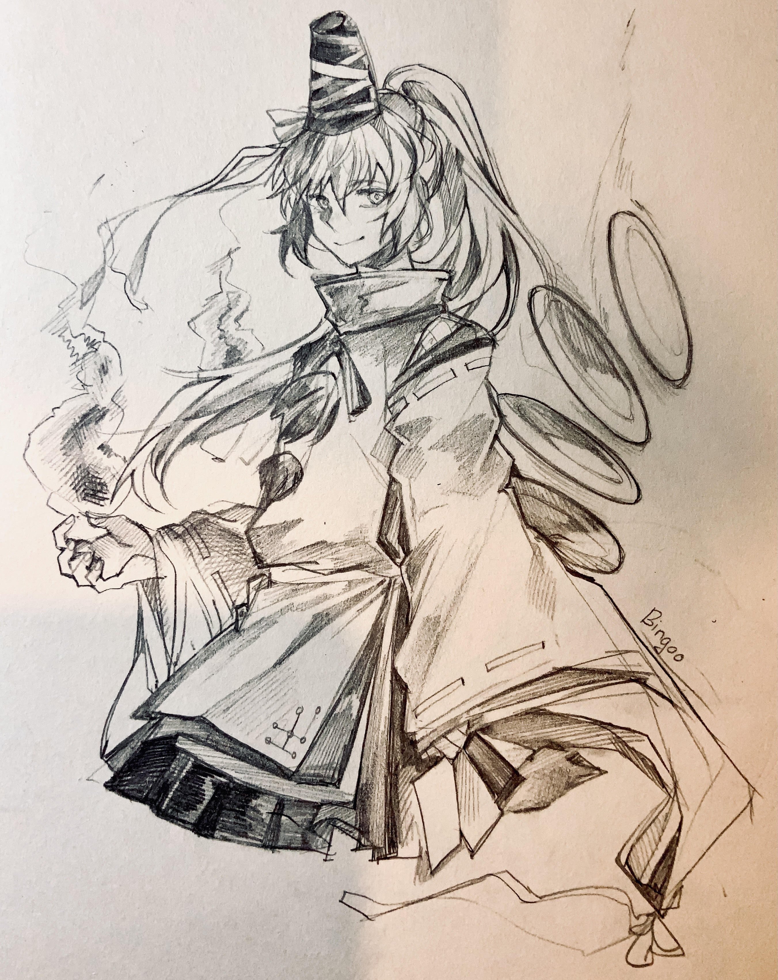 1girl absurdres closed_mouth cropped_legs greyscale hat highres japanese_clothes kabocha1408 kariginu long_hair long_sleeves looking_at_viewer monochrome mononobe_no_futo plate pom_pom_(clothes) ponytail ribbon-trimmed_sleeves ribbon_trim signature sketch skirt smile solo tate_eboshi touhou