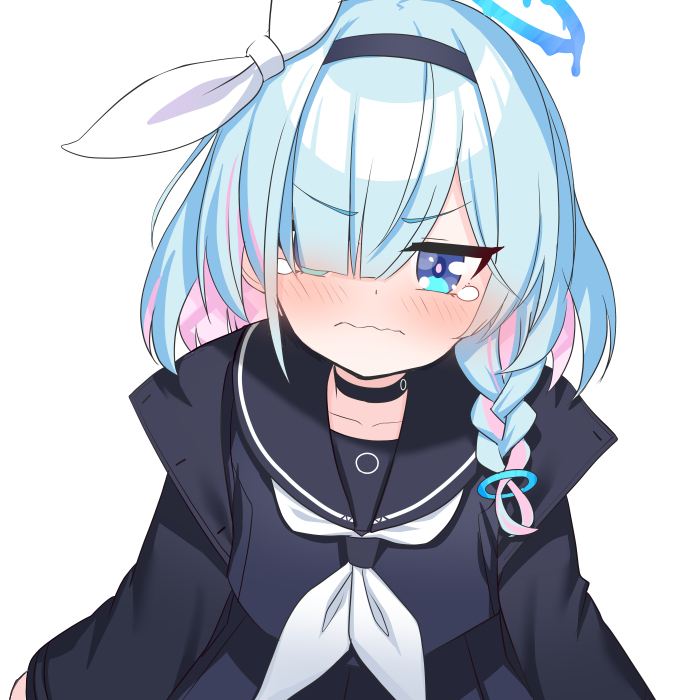 1girl arona_(blue_archive) black_choker black_coat black_hairband black_sailor_collar black_serafuku blue_archive blue_hair blush bow braid choker coat colored_inner_hair commentary_request cosplay hair_bow hair_over_one_eye hairband halo light_blue_hair medium_hair multicolored_hair neckerchief open_clothes open_coat pink_hair plana_(blue_archive) sailor_collar school_uniform serafuku shooka single_braid solo tearing_up wavy_mouth white_bow white_neckerchief