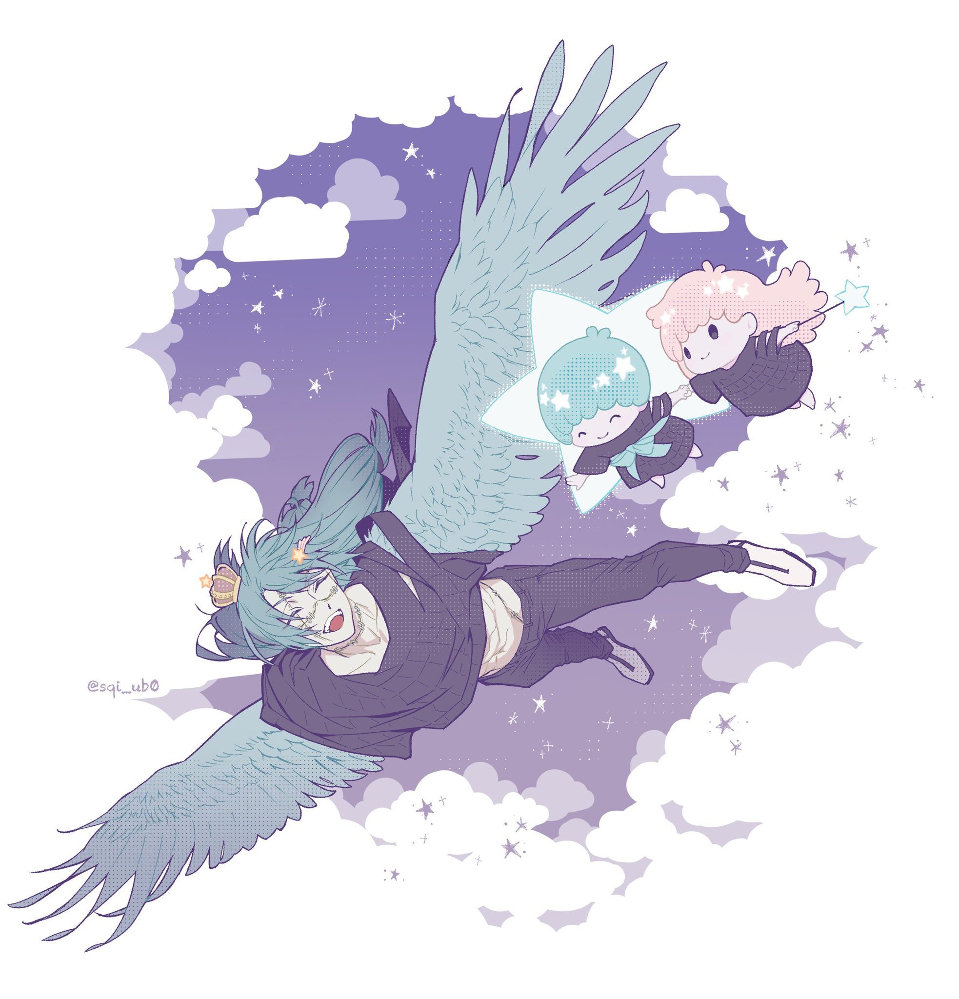 1girl 2boys ^_^ above_clouds abs antenna_hair artist_name asymmetrical_clothes barefoot bird_wings black_dress black_eyes black_pants black_shirt blue_bow blue_hair blue_wings bow closed_eyes closed_mouth cloud cloudy_sky crossover crown dress facing_another flying hair_between_eyes hair_ornament hair_tie hairpin halftone halftone_background happy highres holding holding_hands holding_wand jujutsu_kaisen kiki_(little_twin_stars) lala_(little_twin_stars) light_blue_hair light_blush light_smile little_twin_stars long_hair looking_away low-tied_long_hair mahito_(jujutsu_kaisen) medium_dress midair mini_crown multiple_boys night open_mouth pants pink_hair purple_sky sanrio shirt shoes short_hair sidelocks sky smile sneakers solid_oval_eyes sqi_ub0 star_(sky) star_(symbol) star_hair_ornament star_wand starry_sky stitched_face stitched_neck stitched_torso stitches striped_clothes striped_footwear teeth three-quarter_sleeves transformation twitter_username upper_teeth_only v-shaped_eyebrows vertical-striped_footwear waist_bow wand white_footwear winged_arms wings