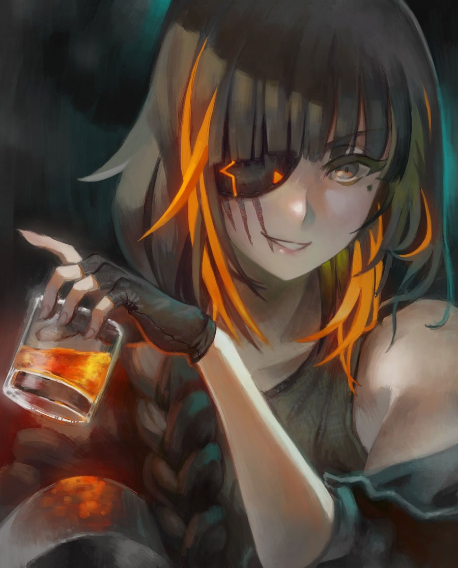 1girl alcohol bare_shoulders black_gloves black_shirt braid brown_eyes brown_hair commentary cup eyepatch fingerless_gloves girls'_frontline glass gloves hair_over_shoulder holding holding_cup jacket long_hair looking_at_viewer m16a1_(girls'_frontline) mole mole_under_eye multicolored_hair off_shoulder orange_hair scar scar_on_face shirt smile solo streaked_hair tank_top upper_body visqi whiskey