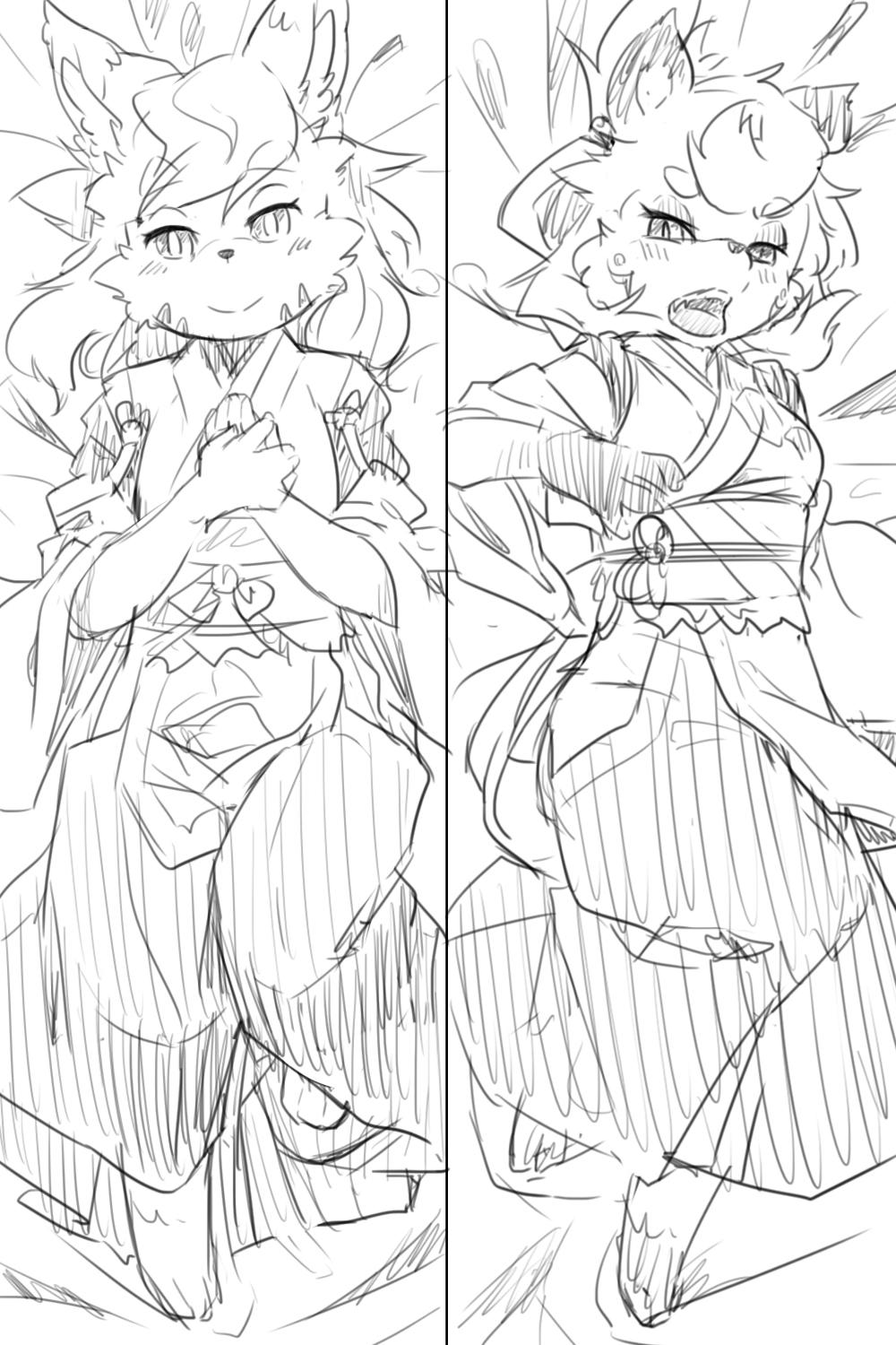 2girls animal_ear_fluff animal_ears animal_feet animal_nose barefoot bed_sheet blush body_fur breasts closed_mouth dakimakura_(medium) detached_sleeves facial_mark female_focus flat_chest fox_ears fox_girl from_above full_body furry furry_female greyscale hakama hakama_skirt half-closed_eyes hand_up hands_on_own_chest hands_up happy highres japanese_clothes kame_(3t) kimono knee_up light_blush long_sleeves looking_at_viewer lying miko monochrome multiple_girls obi on_back open_mouth original own_hands_together raccoon_ears raccoon_girl rin-chan_(kame_(3t)) sash short_hair sketch skirt sleeveless sleeveless_kimono small_breasts smile snout split_mouth straight-on swept_bangs teeth topknot whisker_markings wide_sleeves yhun-chan_(kame_(3t))