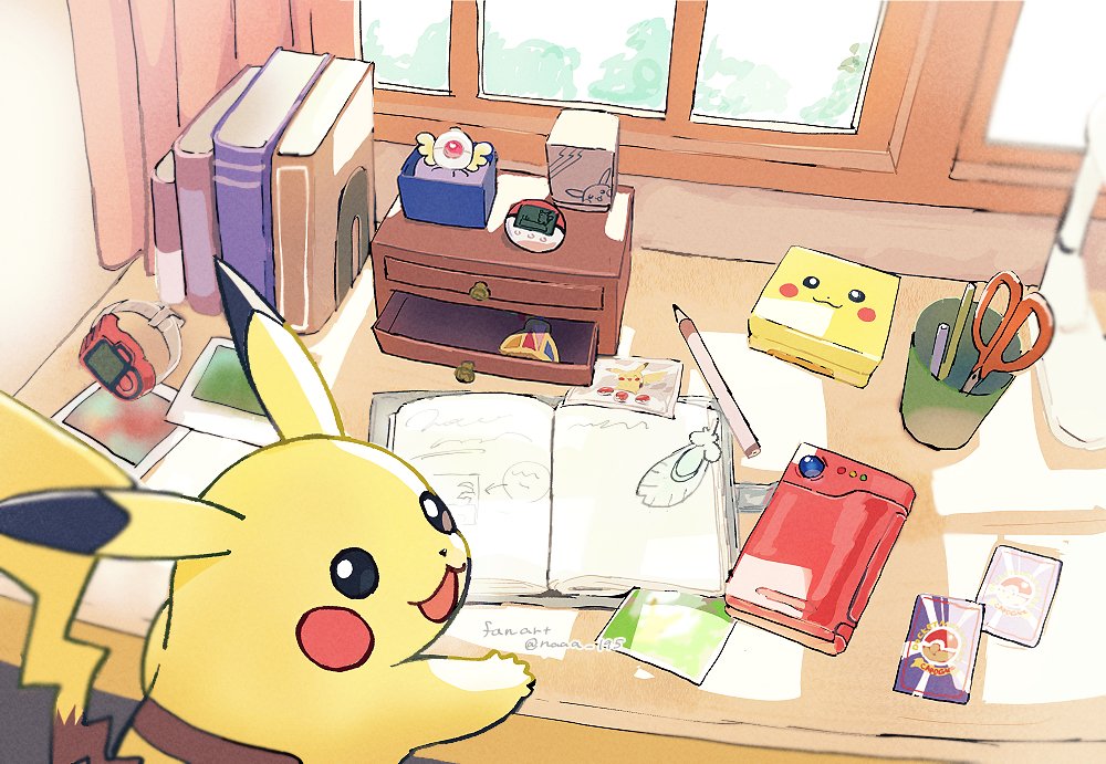 :d black_eyes blurry book card commentary_request curtains desk game_boy_advance game_boy_advance_sp gen_1_pokemon handheld_game_console looking_back nao_(naaa_195) nintendo no_humans notebook open_mouth pencil photo_(object) pikachu pokedex pokemon pokemon_(creature) pokemon_card pokemon_tcg poketch pokewalker scissors smile solo virtual_pet_(toy) watch window wristwatch