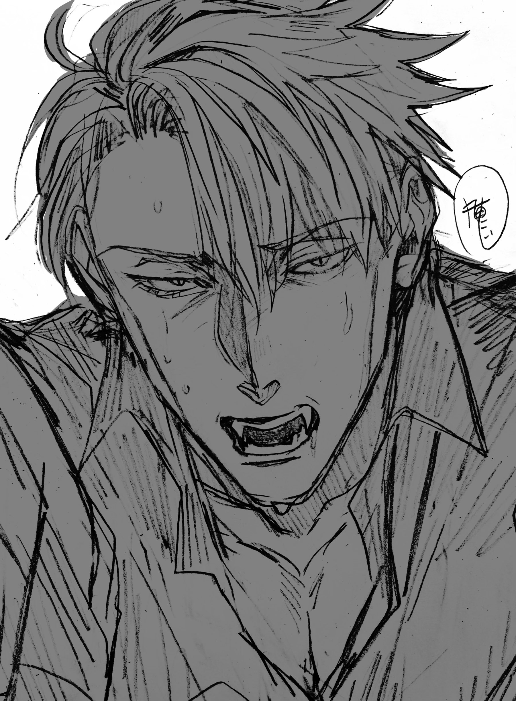 1boy absurdres collared_shirt fangs greyscale highres jujutsu_kaisen looking_at_viewer male_focus monochrome nanami_kento nekonii open_mouth shirt short_hair solo teeth upper_body