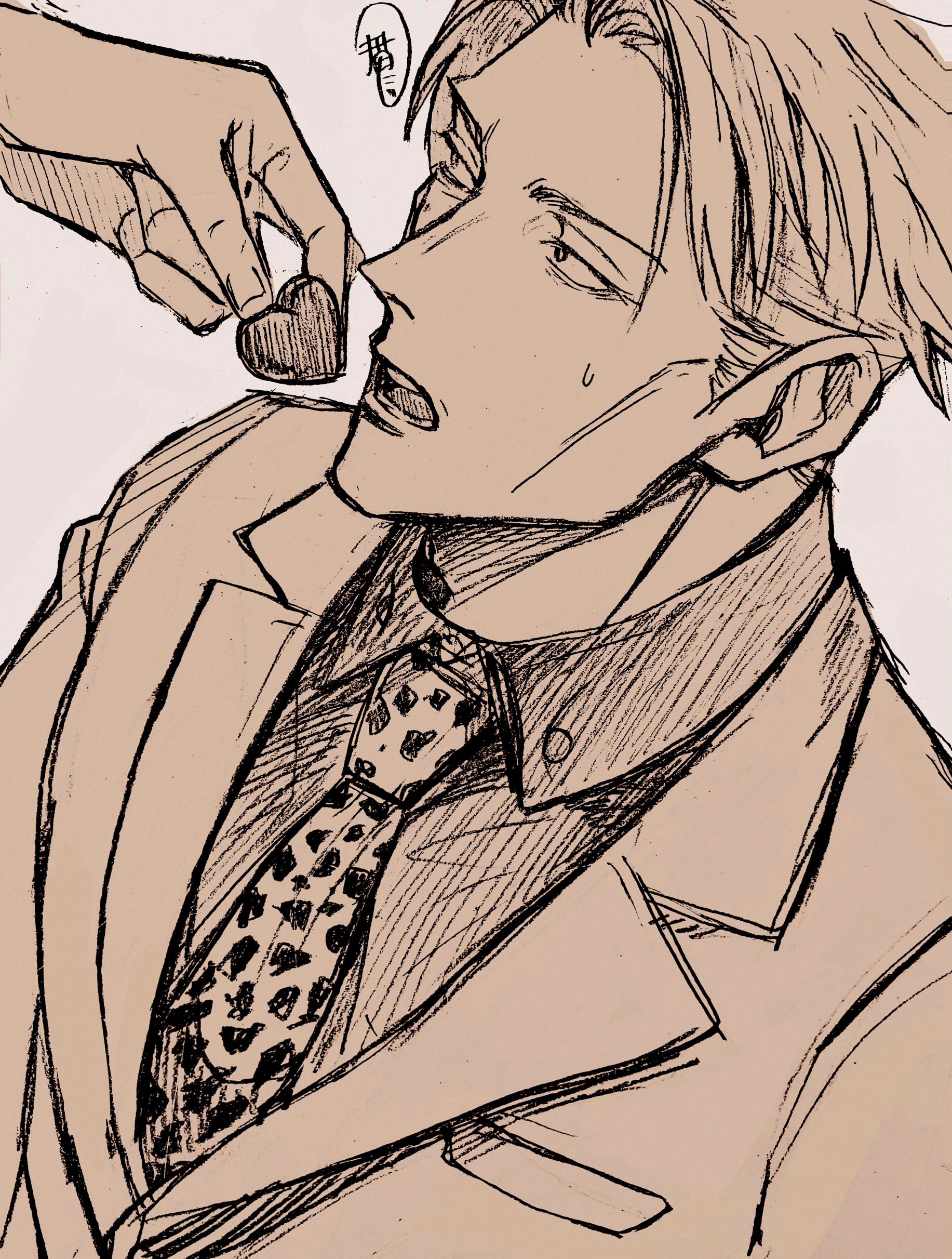 1boy absurdres animal_print candy chocolate chocolate_heart collared_shirt commentary disembodied_hand food formal_clothes heart highres jujutsu_kaisen leopard_print looking_at_viewer nanami_kento necktie nekonii open_mouth shirt short_hair solo suit untranslatable_commentary teeth upper_body