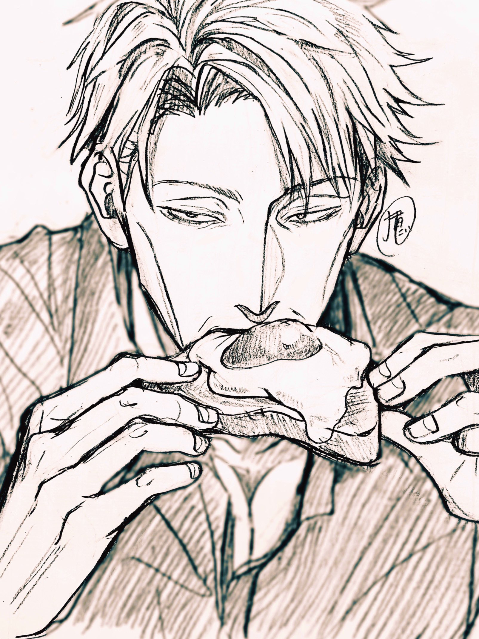 1boy bread breasts cleavage collared_shirt eating egg food fried_egg fried_egg_on_toast greyscale highres holding holding_food jujutsu_kaisen looking_at_viewer male_focus monochrome nanami_kento nekonii shirt short_hair sketch solo toast upper_body