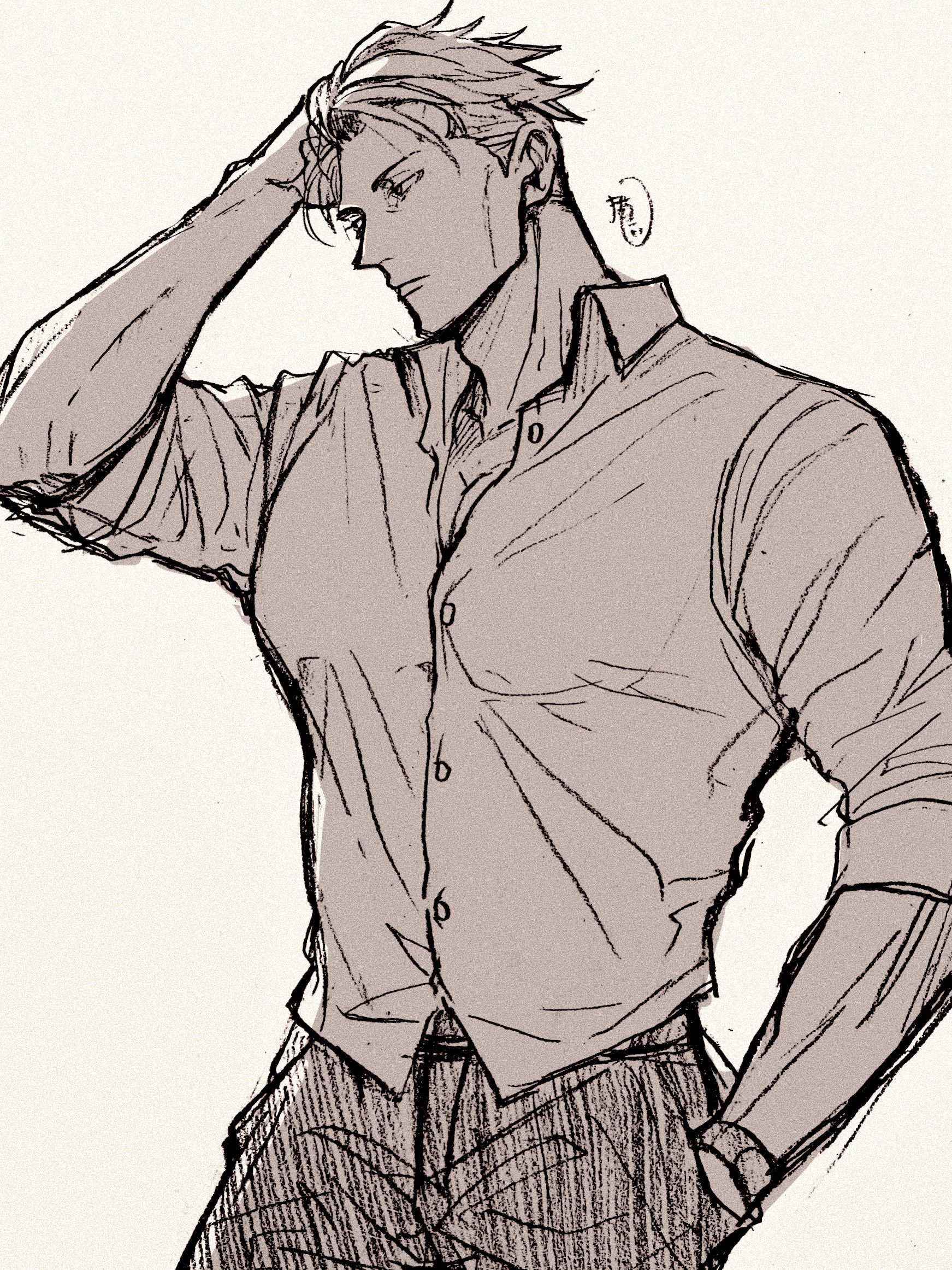 1boy breasts cleavage cowboy_shot greyscale hand_in_own_hair hand_in_pocket highres jujutsu_kaisen long_sleeves male_focus monochrome nanami_kento nekonii pants shirt short_hair sleeves_rolled_up solo standing