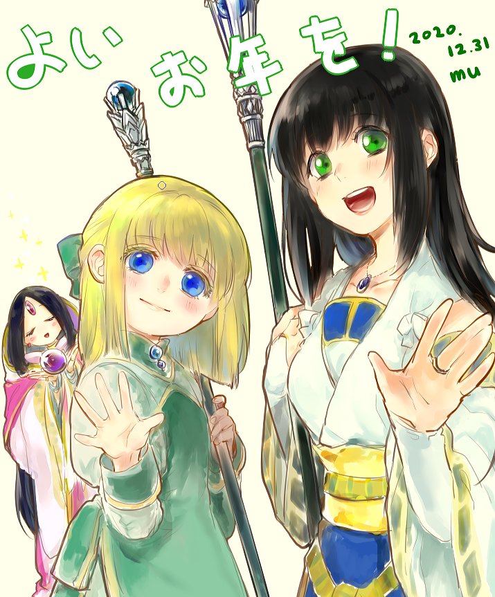 3girls aged_down black_hair blonde_hair blush bridal_gauntlets brown_hair closed_eyes closed_mouth collarbone dated dress gensou_suikoden gensou_suikoden_iii green_eyes ikunosake jewelry leknaat long_hair looking_at_viewer luc_(suikoden) medium_hair multiple_girls necklace open_mouth sarah_(suikoden_iii) simple_background smile staff viki_(suikoden) waving white_background