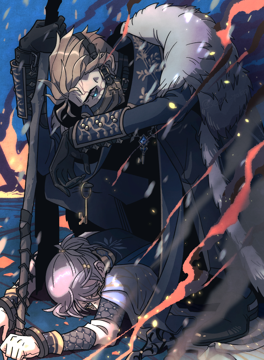 2boys alva_lorenz alva_lorenz_(warden) black_footwear black_gloves black_sclera blonde_hair blue_cloak blue_eyes blue_jacket blue_pants bound bound_wrists burning cape cloak colored_sclera covered_mouth cuffs embers facial_mark fire full_body fur-trimmed_cloak fur_trim gloves grey_eyes grey_hair hair_between_eyes hair_slicked_back hair_tubes highres holding holding_key holding_staff identity_v jacket key looking_at_another luca_balsa luca_balsa_(winter_cicada) lying male_focus mask mouth_mask multiple_boys official_alternate_costume on_stomach pants ponytail scowl shirt shoes short_hair short_ponytail sleeve_cuffs smoke squatting staff stepping_on_clothes upper_body wanijima_gaburi white_cape white_shirt