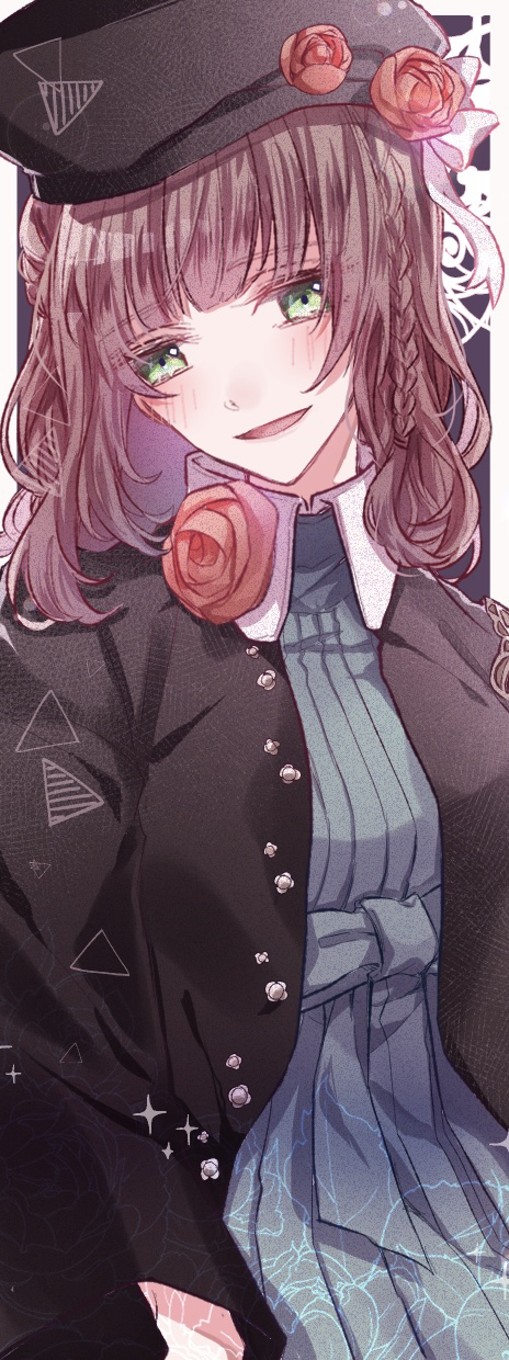 1girl aiaiharuharu amnesia_(idea_factory) black_jacket blue_dress blush border braid brown_hair dress flower green_eyes hat heroine_(amnesia) highres jacket long_sleeves looking_at_viewer open_mouth pink_flower pink_rose purple_background rose short_hair smile solo white_border