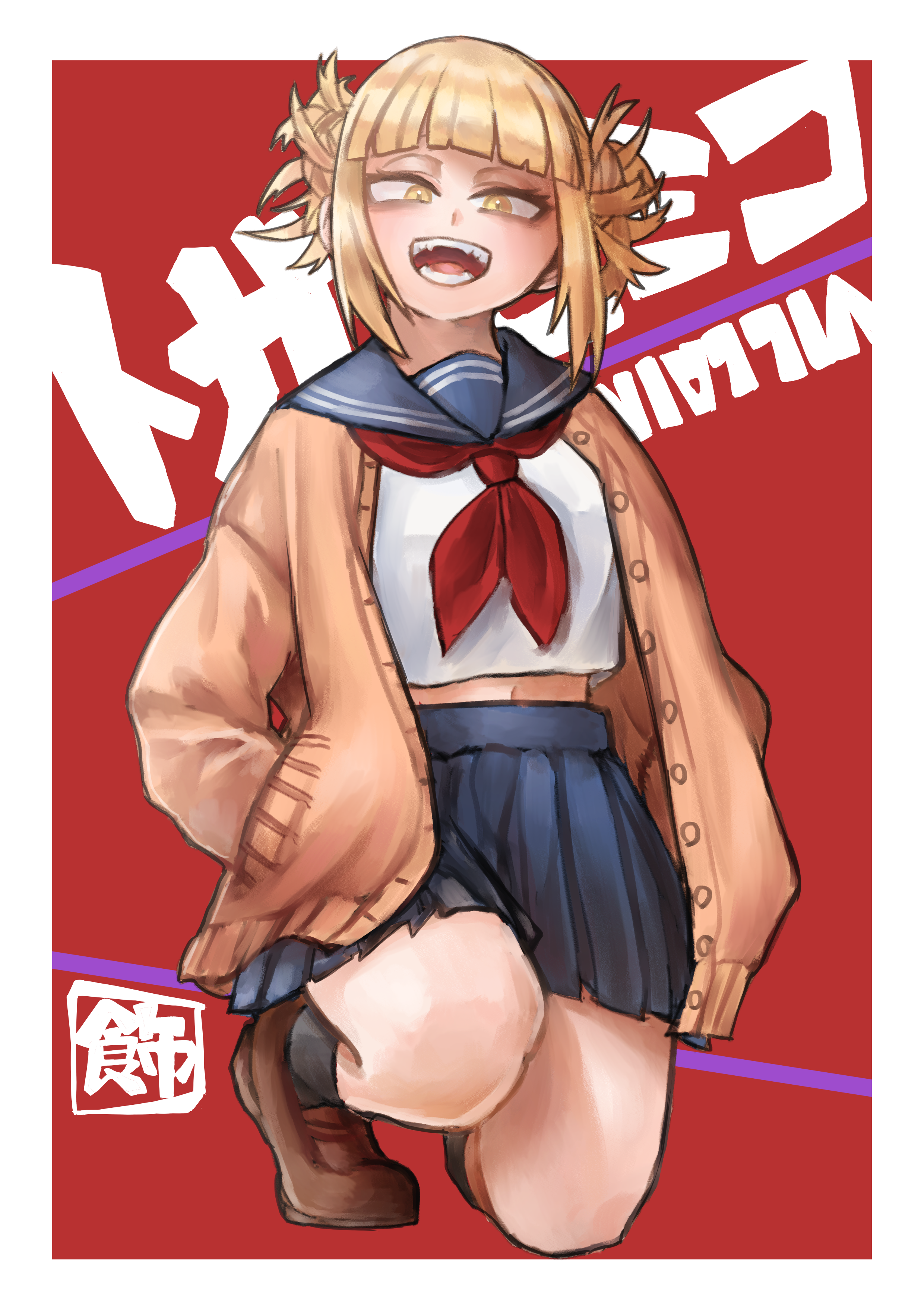1girl absurdres blonde_hair blue_skirt blunt_bangs boku_no_hero_academia cardigan double_bun hair_bun highres kazari_kabocya loafers messy_hair midriff open_cardigan open_clothes open_mouth pleated_skirt school_uniform serafuku shoes sidelocks skirt slit_pupils solo toga_himiko yellow_eyes