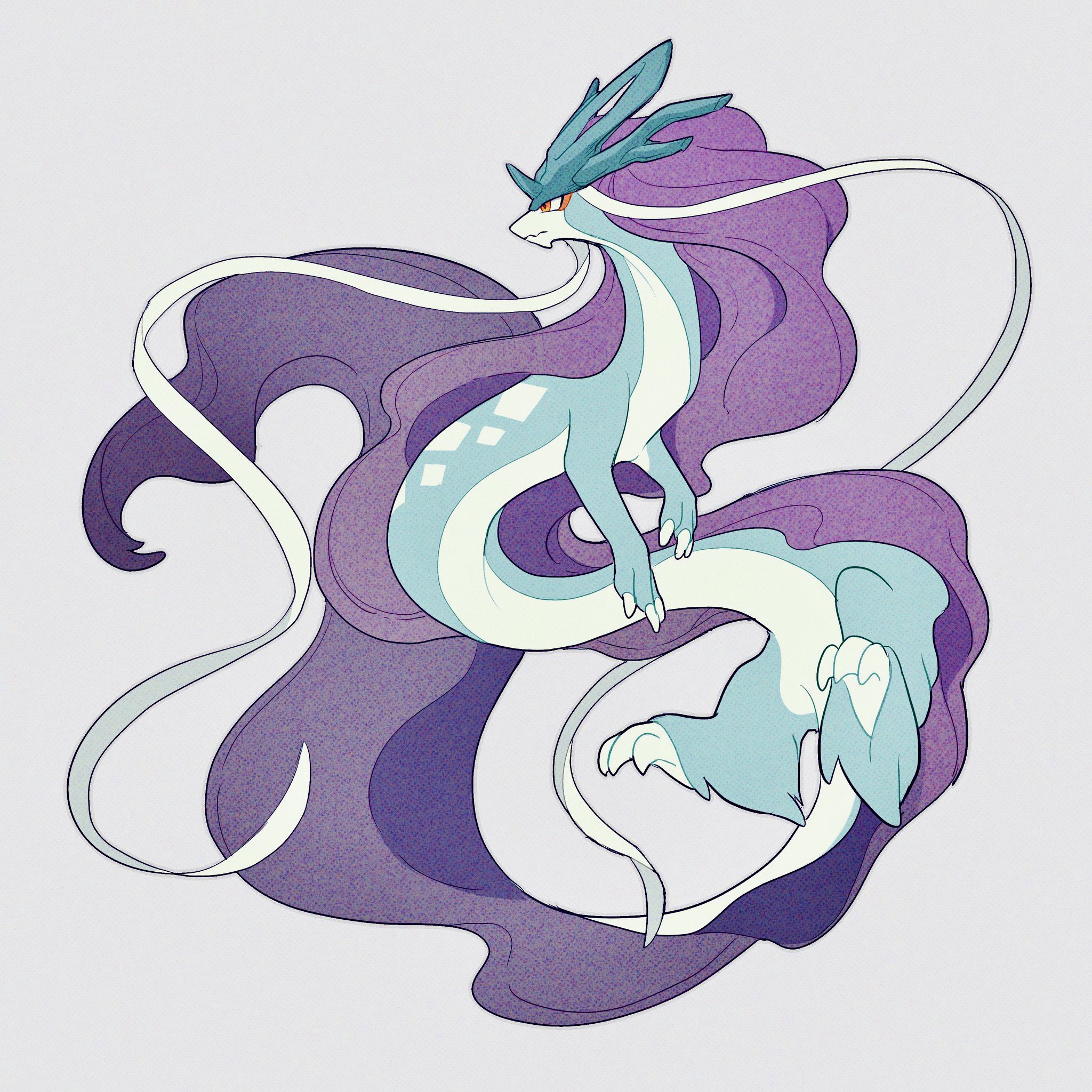 absurdly_long_hair alternate_species animal_focus claws closed_mouth dragon eastern_dragon gen_2_pokemon grey_background highres legendary_pokemon long_hair looking_to_the_side mee_(mee0118) nintendo no_humans pokemon pokemon_(creature) profile purple_hair red_eyes ribbon simple_background solo suicune very_long_hair white_ribbon