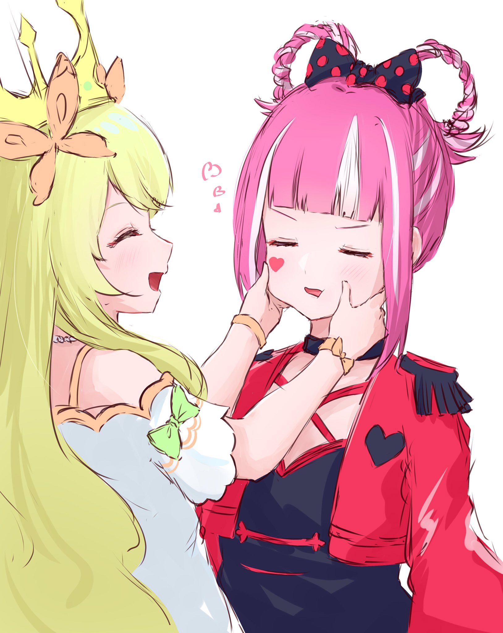 2girls black_dress blonde_hair bow butterfly_hair_ornament celine_(fire_emblem) closed_eyes crown dress facial_mark fire_emblem fire_emblem_engage hair_bow hair_ornament hair_rings hands_on_another's_cheeks hands_on_another's_face heart heart_facial_mark highres hortensia_(fire_emblem) lillian8710 long_hair multicolored_hair multiple_girls nintendo open_mouth pink_hair two-tone_hair upper_body white_background white_dress white_hair