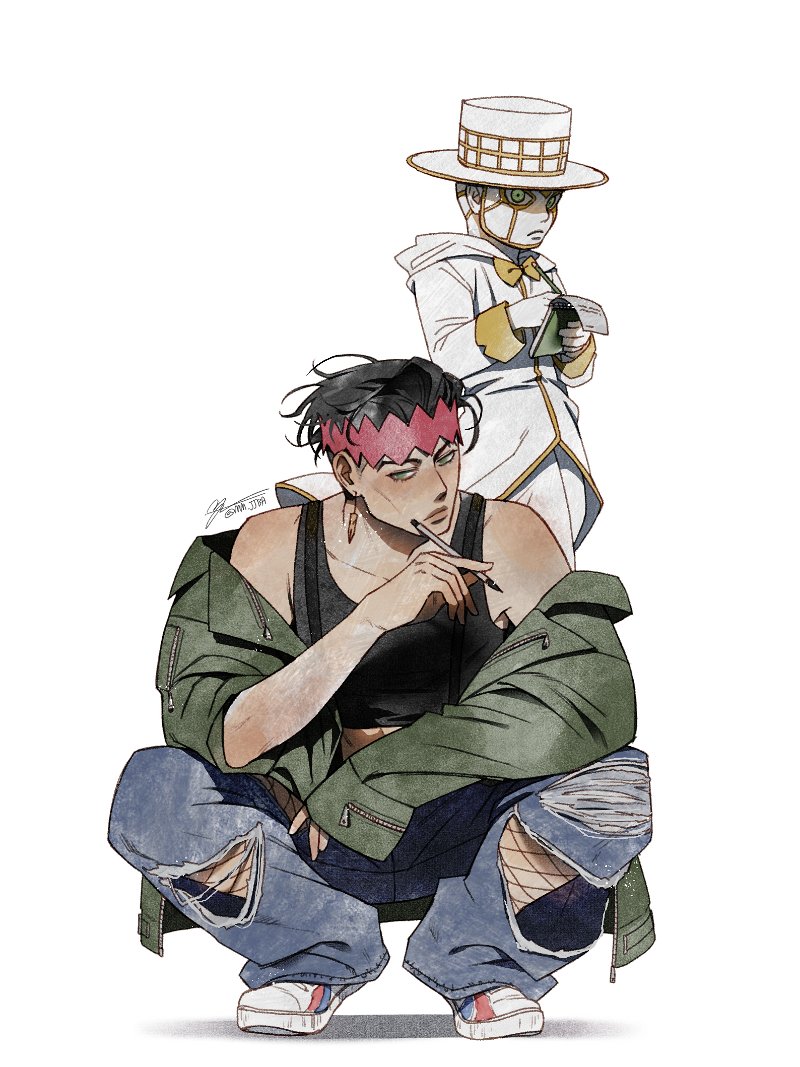 1boy 1other black_hair black_tank_top commentary crop_top denim diamond_wa_kudakenai earrings fishnet_socks fishnets frown green_eyes green_jacket headband heaven's_door holding holding_notepad holding_pen jacket jeans jewelry jojo_no_kimyou_na_bouken kishibe_rohan korean_commentary male_focus mm_jjba notepad off_shoulder pants pen red_headband shoes signature sneakers socks squatting stand_(jojo) tank_top torn_clothes torn_pants writing