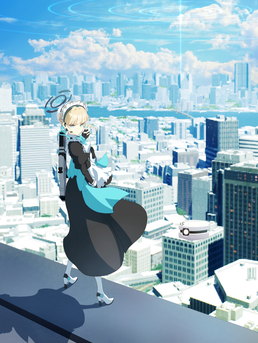 1girl black_dress blonde_hair blue_archive blue_eyes blue_sky building city cityscape cloud commentary_request day dress full_body gloves halo hat headset high_heels keika_(otsukare) long_hair long_sleeves looking_at_viewer maid_headdress mechanical_halo outdoors ring_of_light_(blue_archive) scenery shadow sky solo standing toki_(blue_archive)