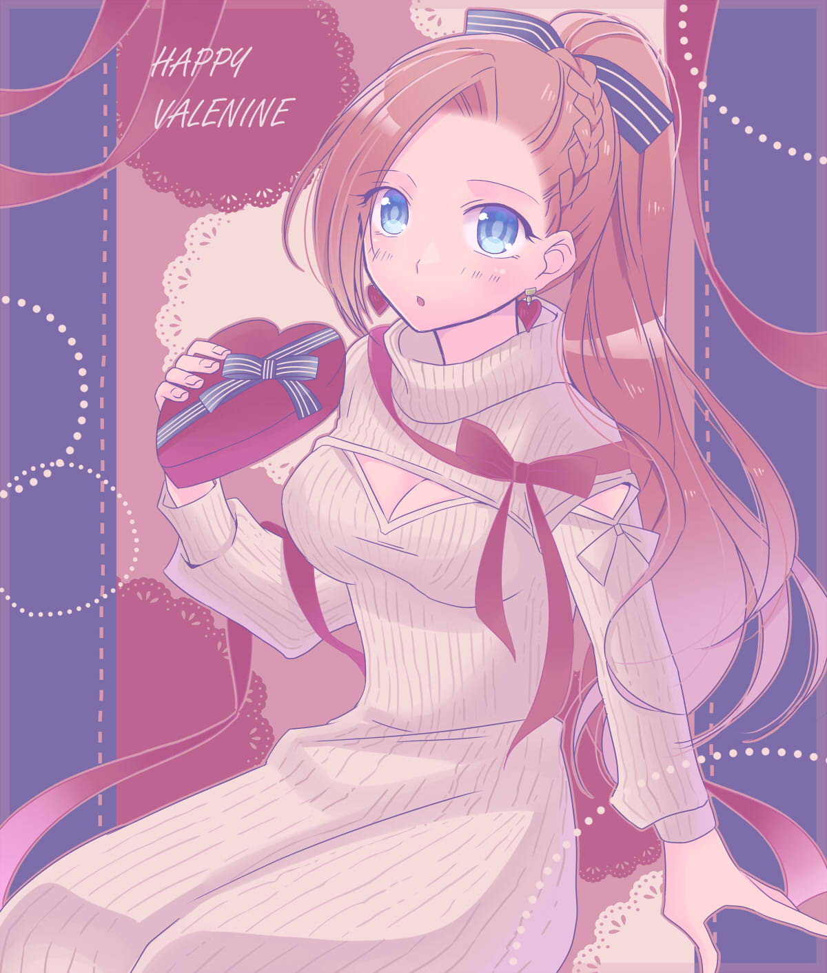 1girl :o alternate_hairstyle asymmetrical_bangs black_ribbon blue_eyes box braid breasts brown_hair cleavage_cutout clothing_cutout commentary contemporary doily dress earrings english_text gift grey_dress hair_ribbon happy_valentine heart heart-shaped_box heart_earrings highres holding holding_gift jewelry katarina_claes light_blush long_dress long_hair long_sleeves looking_at_viewer medium_breasts otome_game_no_hametsu_flag_shika_nai_akuyaku_reijou_ni_tensei_shite_shimatta parted_lips ponytail red_ribbon ribbed_dress ribbon shoulder_cutout sitting solo turtleneck turtleneck_dress valentine zhu_(c-liberty)