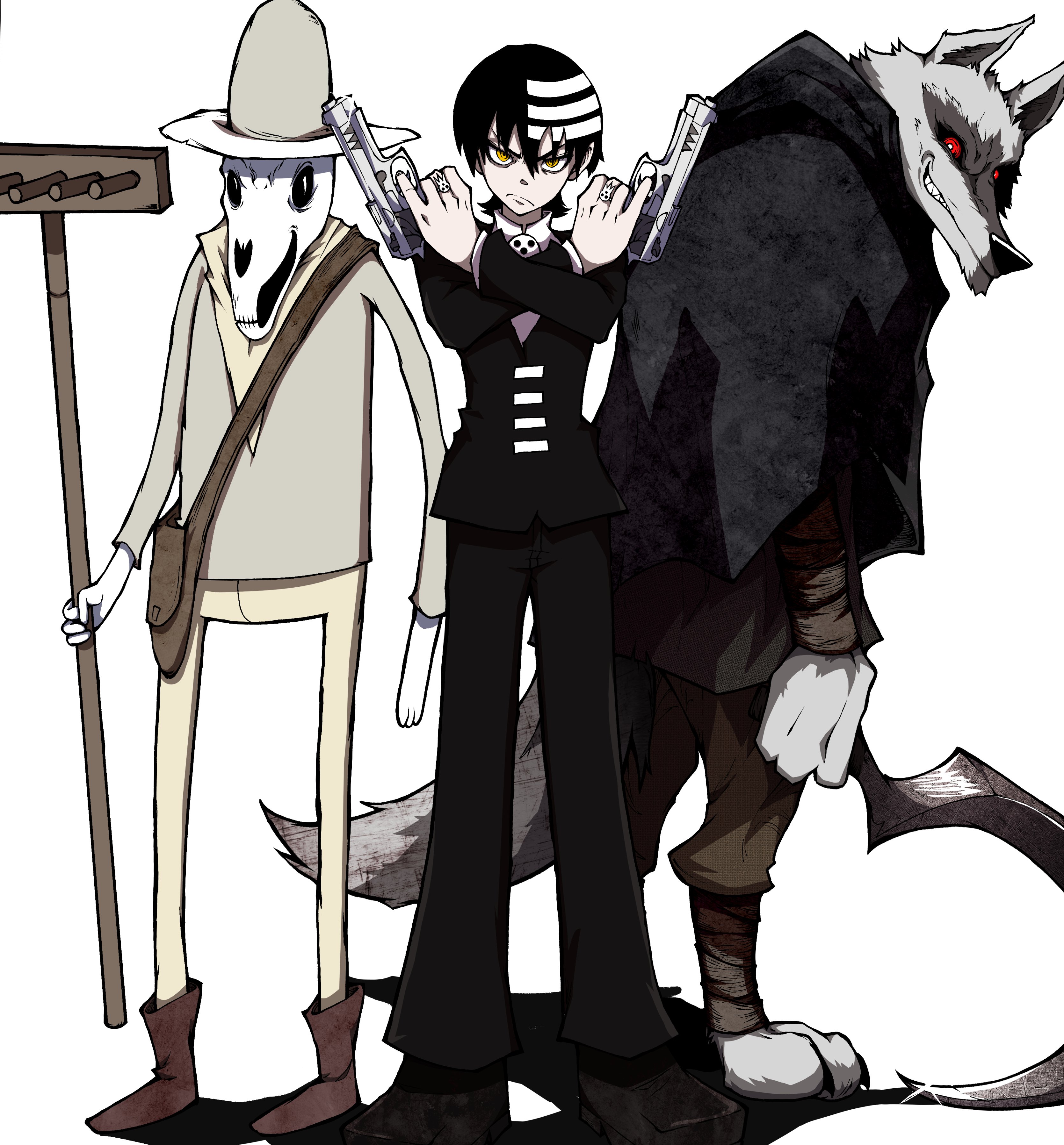 3boys absurdres adventure_time animal_nose black_hair black_pants boots cloak closed_mouth collared_shirt colored_sclera crossover death_(adventure_time) death_(puss_in_boots) death_the_kid dual_wielding frown furry furry_male grin gun hat highres holding holding_gun holding_weapon kekel long_sleeves looking_at_viewer multicolored_hair multiple_boys multiple_crossover name_connection pants puss_in_boots:_the_last_wish red_sclera shirt shrek_(series) skeleton smile snout soul_eater weapon white_hair
