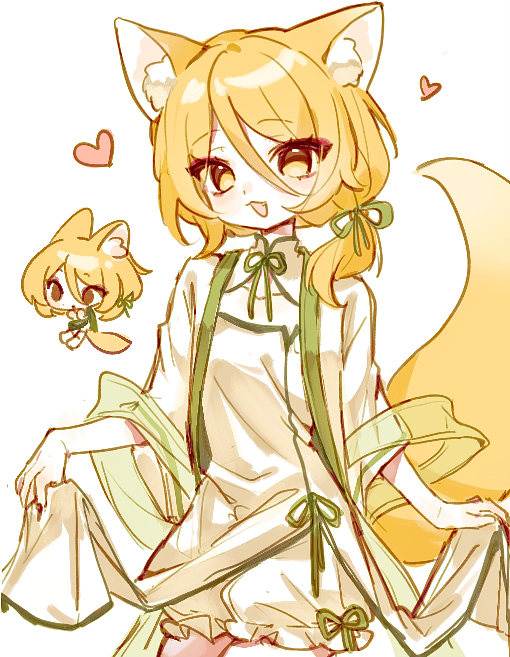 1girl :d absurdres adapted_costume animal_ear_fluff animal_ears blonde_hair blush chibi chibi_inset clothes_lift cowboy_shot dress fang fox_ears fox_tail hair_between_eyes hair_over_shoulder heart highres holding_own_skirt kudamaki_tsukasa lifting_own_clothes long_hair open_mouth ribbon simple_background skirt skirt_lift smile solo springarashi02 tail touhou white_background