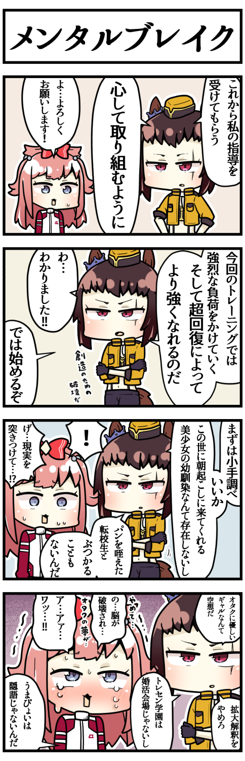 ! 2girls 4koma agnes_digital_(umamusume) animal_ears black_gloves blue_background bow brown_hair byerley_turk_(umamusume) comic commentary_request cropped_jacket crossed_arms crying crying_with_eyes_open ear_ornament garrison_cap gloves hair_bow hat highres horse_ears horse_girl horse_tail jacket long_hair midriff military_jacket motion_lines multiple_girls navel nervous_sweating open_clothes open_jacket otaku outline purple_background red_bow red_eyes red_jacket sakai_waka scar scar_across_eye scar_on_face short_hair speech_bubble spoken_exclamation_mark sweat tail tears translation_request trembling umamusume umapyoi_(phrase) v-shaped_eyebrows yellow_background yellow_headwear yellow_jacket