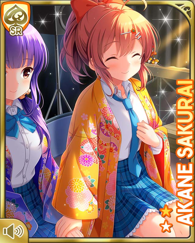 2girls black_socks blouse blue_neckwear blue_skirt bow brown_eyes brown_hair card_(medium) chair character_name closed_eyes day girlfriend_(kari) hair_bow hair_ornament ichinose_tomoe_(gf_kari) indoors japanese_clothes kimono kneehighs looking_at_viewer multiple_girls necktie nervous official_art orange_kimono plaid_clothes plaid_skirt pleated_skirt ponytail purple_hair purple_kimono qp:flapper red_eyes sakurai_akane_(girlfriend_(kari)) school_uniform shirt sitting skirt smile socks sparkle white_shirt
