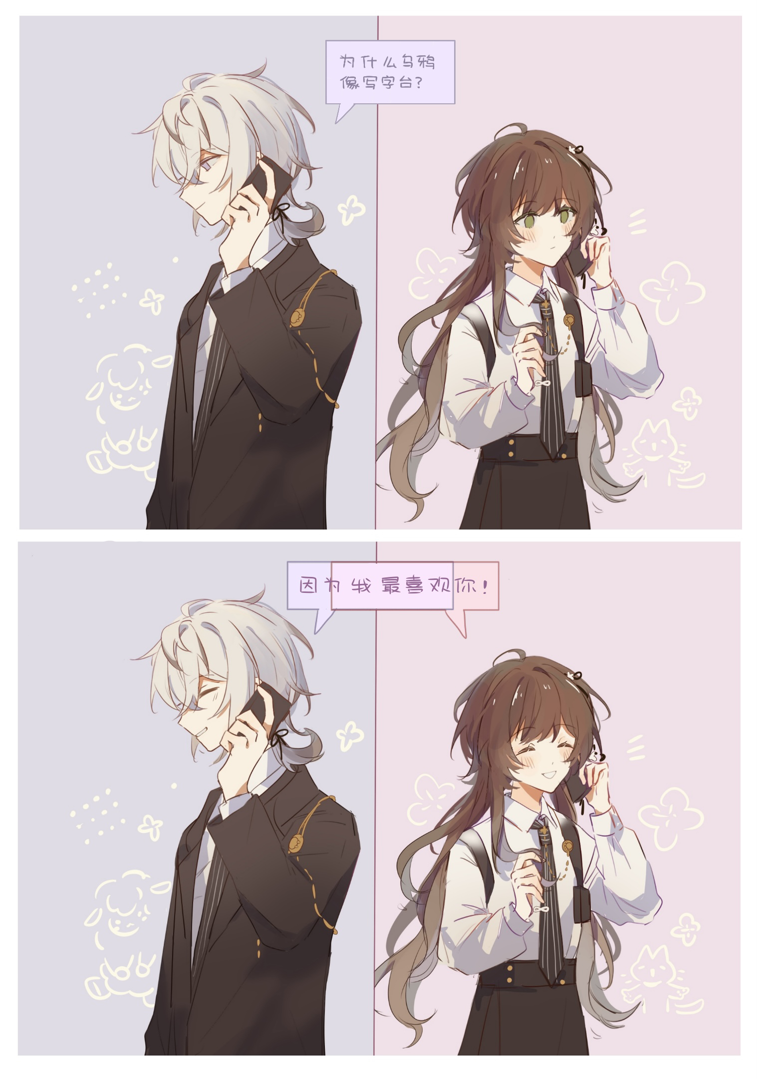 1boy 1girl blue_background border brown_hair cellphone chinese_text collar_x_malice facing_to_the_side green_eyes grey_hair hetero highres holding holding_phone hoshino_ichika_(collar_x_malice) long_hair long_sleeves multicolored_hair okazaki_kei phone pink_background short_hair translation_request w047 white_border white_hair