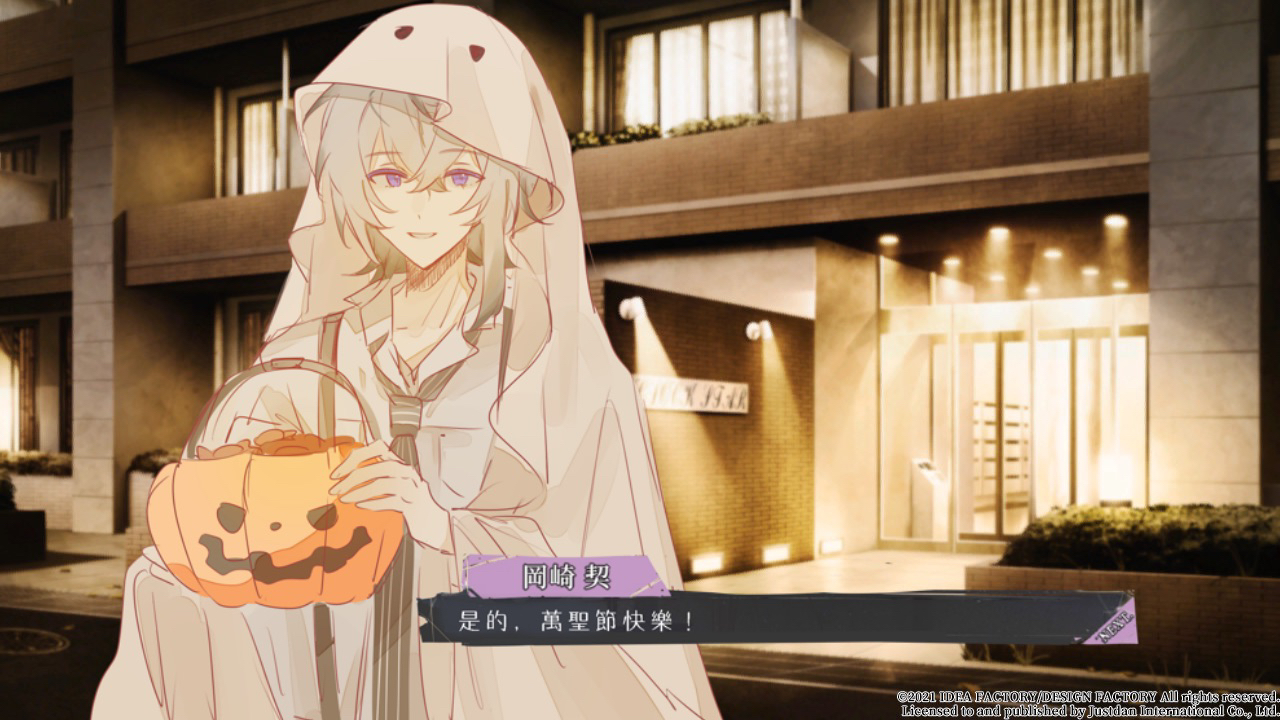 1boy black_necktie collar_x_malice collared_shirt derivative_work ghost_costume grey_hair halloween halloween_costume jack-o'-lantern long_sleeves looking_at_viewer male_focus multicolored_hair necktie okazaki_kei purple_eyes shirt short_hair solo translation_request w047 white_hair white_shirt