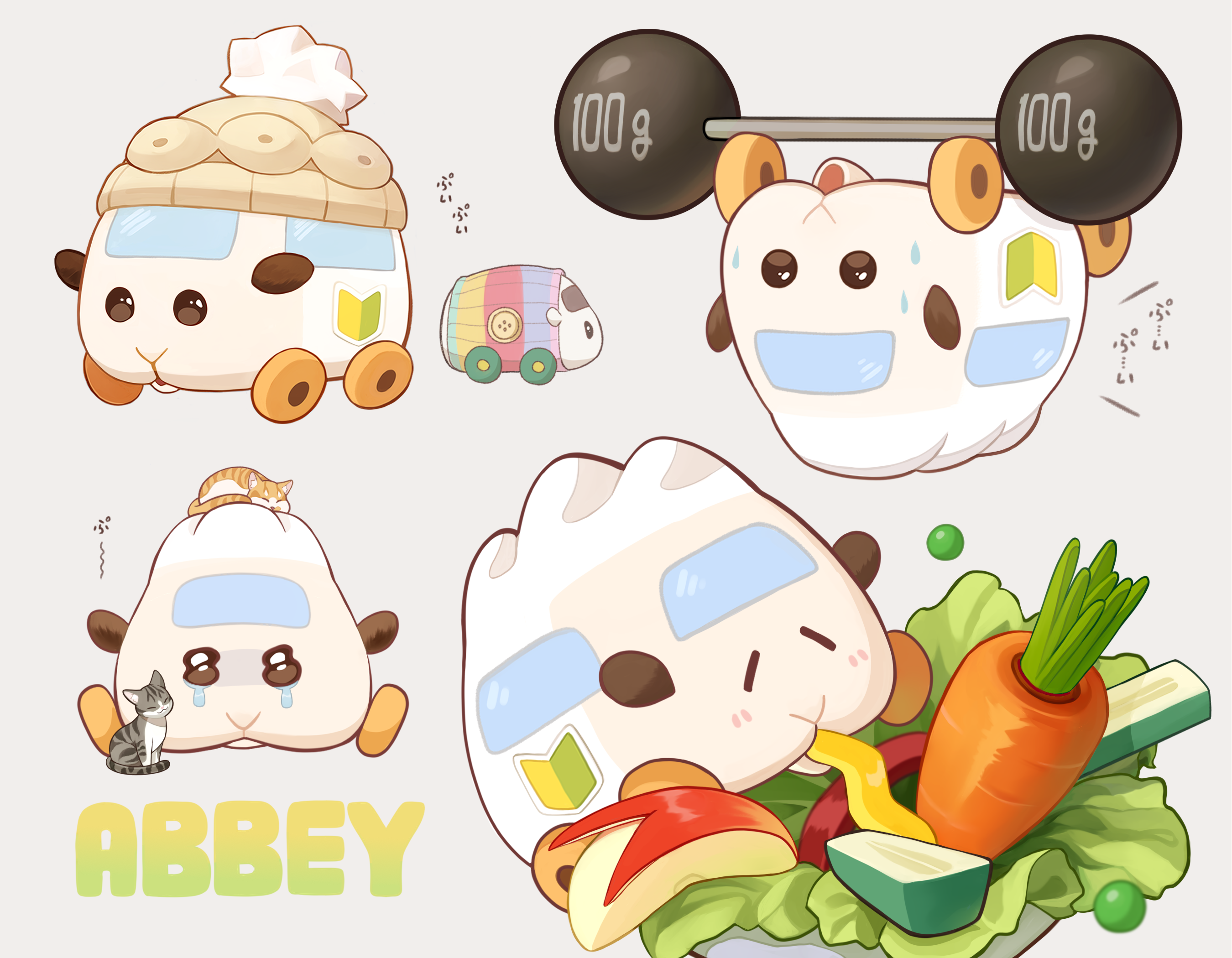 abbey_(pui_pui_molcar) animal_focus apple apple_slice black_eyes bowl carrot cat cucumber eating ekoru exercising flower food fruit grey_background guinea_pig highres long_hair molcar motor_vehicle no_humans open_mouth pui_pui_molcar shoshinsha_mark simple_background smile sweat sweater vegetable weightlifting wheel