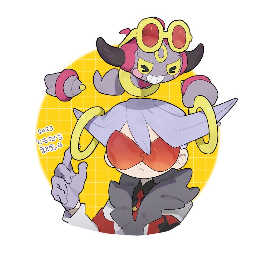 >_< 1boy armband black_shirt closed_mouth coat dated frown fur-trimmed_coat fur_trim gen_6_pokemon gloves grin hand_up hoopa hoopa_(confined) lear_(pokemon) legendary_pokemon long_sleeves male_focus mimura_(nnnnnnnnmoo) mythical_pokemon necktie nintendo pokemon pokemon_(creature) pokemon_masters_ex red-tinted_eyewear red_necktie shirt smile sunglasses teeth tinted_eyewear yellow-framed_eyewear
