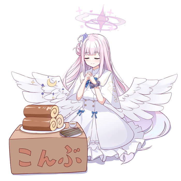 1girl angel_wings blue_archive blunt_bangs box cake capelet cardboard_box commentary_request dress feathered_wings food frilled_dress frills hair_bun hair_ornament halo interlocked_fingers long_hair mika_(blue_archive) miso_soup one_side_up own_hands_together pink_hair plate praying school_uniform scrunchie seaweed shooka sidelocks simple_background single_side_bun sitting smile solo swiss_roll translation_request white_background white_dress white_wings wings wrist_scrunchie
