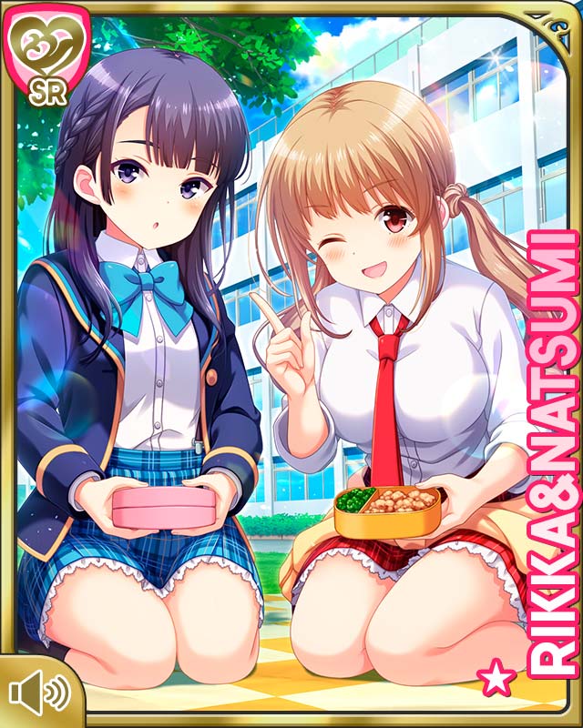 2girls :o black_hair blazer blue_bow blue_jacket blue_skirt bow bowtie braid breasts brown_hair card_(medium) character_name girlfriend_(kari) jacket kneeling medium_hair multiple_girls necktie official_art one_eye_closed open_mouth outdoors plaid_clothes plaid_skirt purple_eyes qp:flapper red_eyes red_necktie red_skirt sakaida_natsumi school_uniform shirouzu_rikka shirt shoes skirt small_breasts smile socks suspenders tagme tied_sweater uneven_bangs white_shirt wink