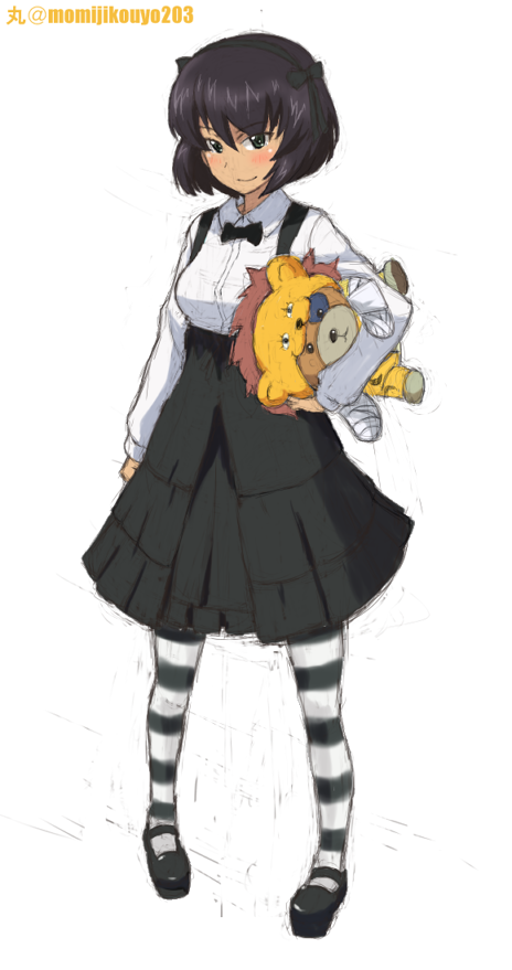 1girl artist_name black_bow black_bowtie black_hair black_pantyhose black_ribbon black_shoes black_skirt bob_cut boko_(girls_und_panzer) bow bowtie closed_mouth collared_shirt commentary cosplay dark-skinned_female dark_skin full_body girls_und_panzer green_eyes hair_ribbon high-waist_skirt holding holding_stuffed_toy hoshino_(girls_und_panzer) kayabakoro leopon_(animal) long_sleeves looking_at_viewer mary_janes medium_skirt pantyhose ribbon shimada_arisu shimada_arisu_(cosplay) shirt shoes short_hair simple_background skirt smile solo standing striped_clothes striped_pantyhose stuffed_animal stuffed_toy suspender_skirt suspenders teddy_bear twitter_username white_background white_shirt