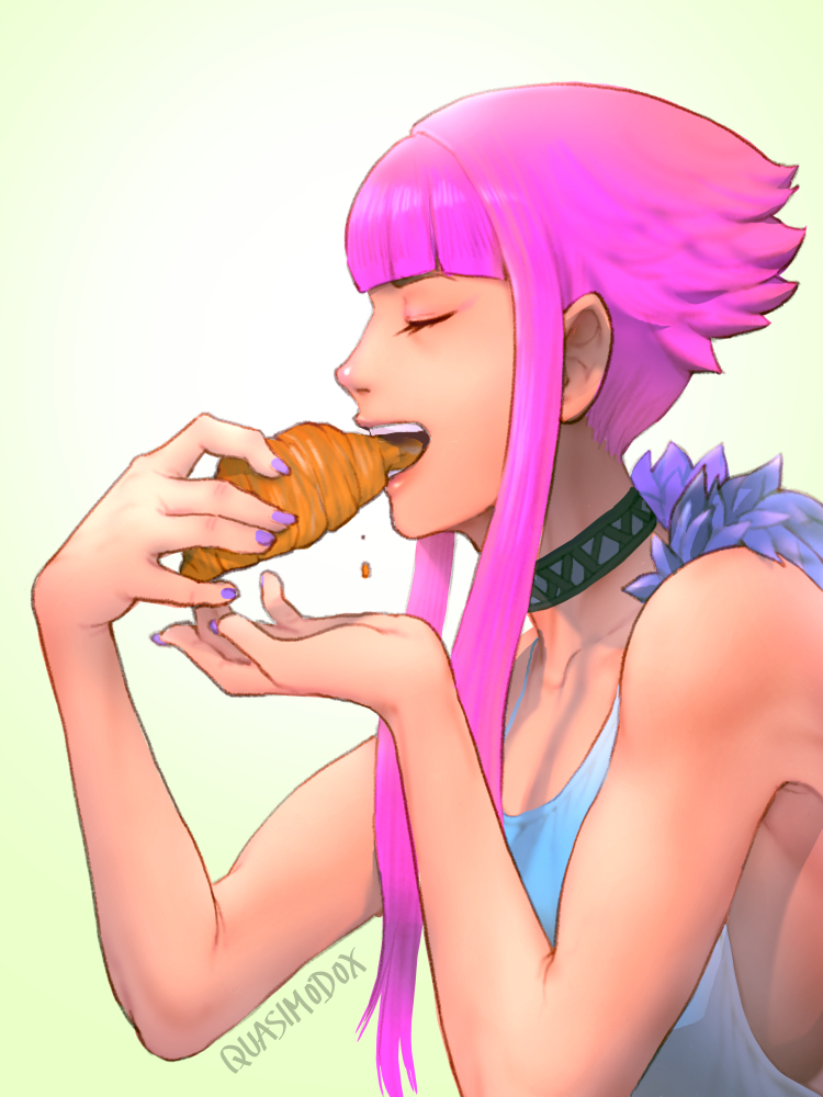1girl black_choker breasts choker closed_eyes commentary croissant eating english_commentary fingernails food holding holding_food large_breasts manon_legrand no_bra pink_hair purple_nails quasimodox short_hair_with_long_locks sideboob sleeveless solo street_fighter street_fighter_6 tank_top white_tank_top