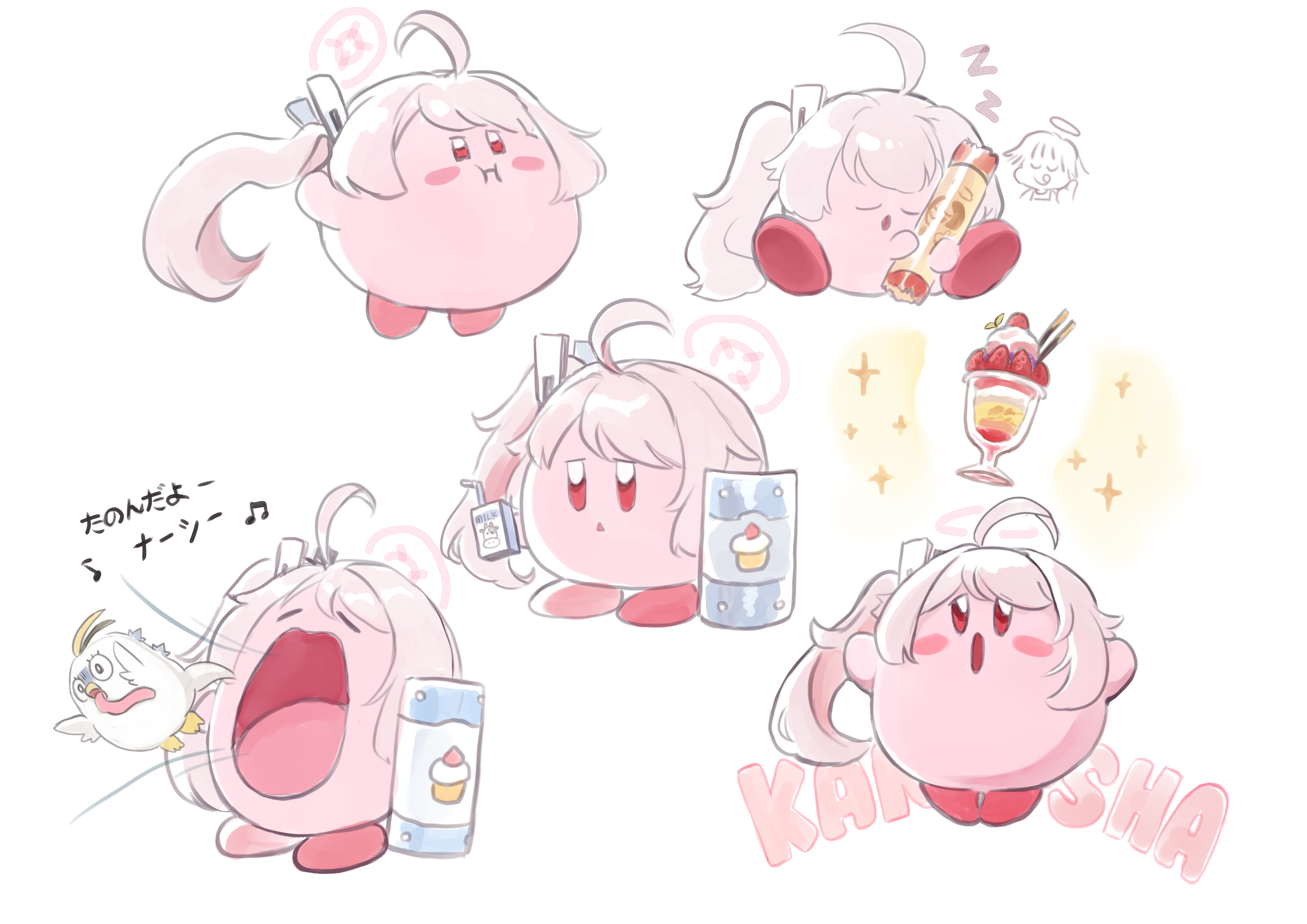 1girl absurdres ahoge blue_archive blush_stickers chibi drink_carton ekoru food hair_ornament hairclip halo highres kirby kirby_(series) long_hair looking_at_viewer milk_carton natsu_(blue_archive) nintendo open_mouth parfait peroro_(blue_archive) pink_hair red_eyes riot_shield shield side_ponytail strawberry_parfait translation_request warp_star zzz