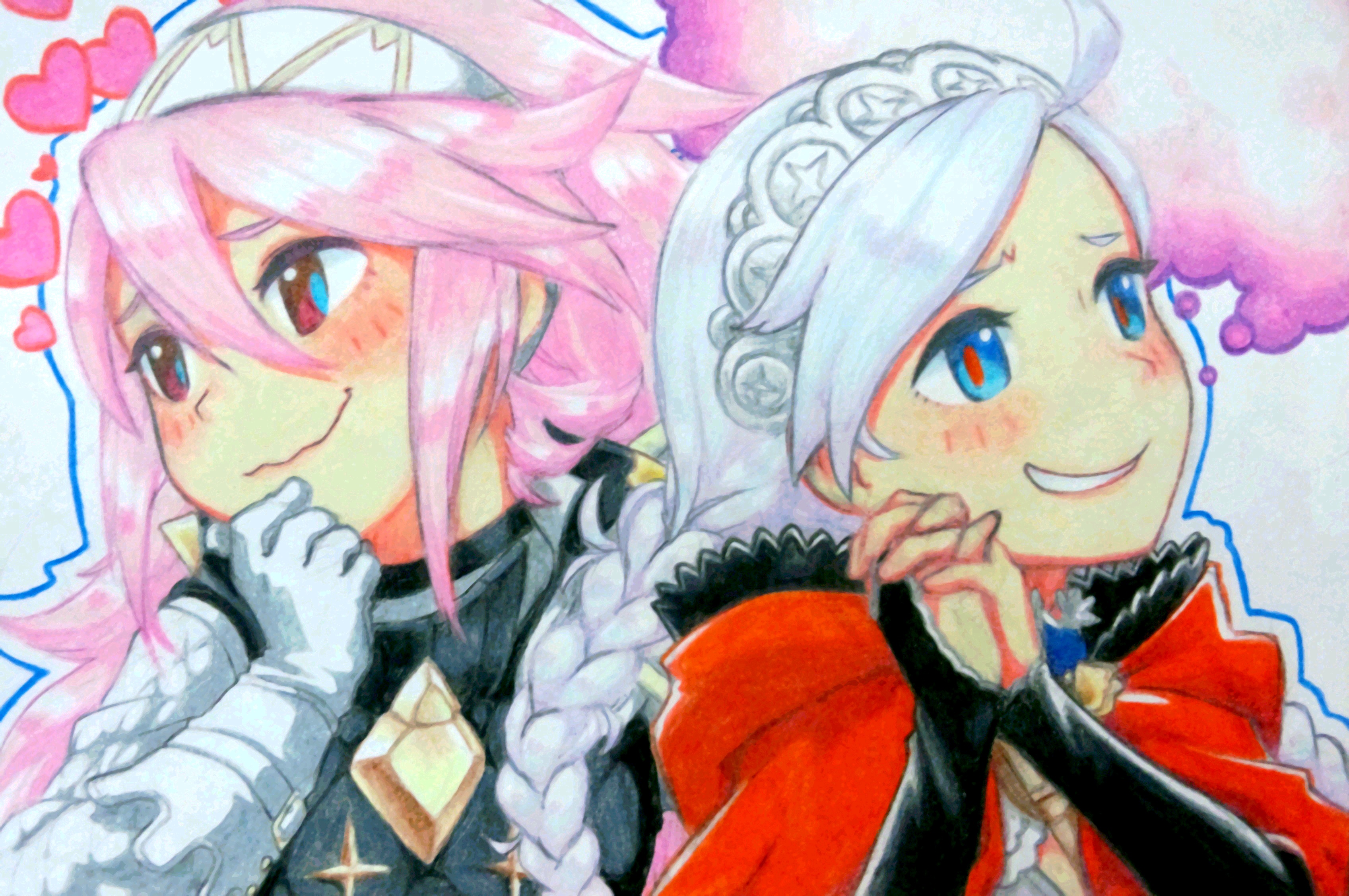 2girls absurdres ahoge blue_eyes braid capelet fire_emblem fire_emblem_fates fujoshi highres hood hood_down hooded_capelet lico_(sasya_k) low_twin_braids multiple_girls nina_(fire_emblem) nintendo open_mouth own_hands_together parted_bangs red_capelet smile soleil_(fire_emblem) twin_braids