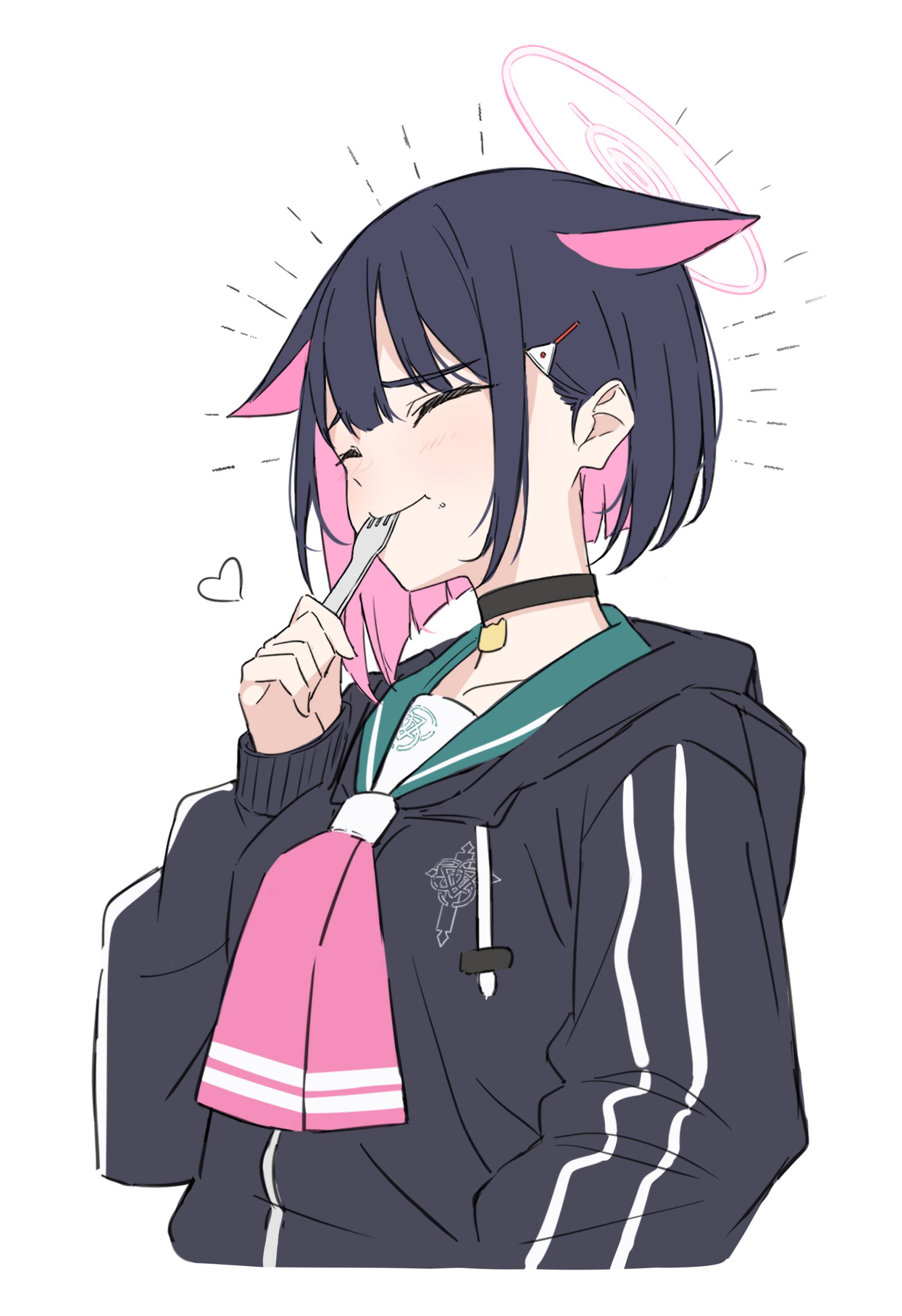 1girl absurdres animal_ears aqua_sailor_collar black_choker black_hair blue_archive blush choker closed_eyes closed_mouth colored_inner_hair cropped_torso extra_ears food food_on_face fork halo heart highres hood hood_down hooded_jacket jacket kazusa_(blue_archive) long_sleeves multicolored_hair neckerchief ochiai_miyabi pink_hair pink_neckerchief sailor_collar short_hair simple_background solo two-tone_hair upper_body utensil_in_mouth white_background