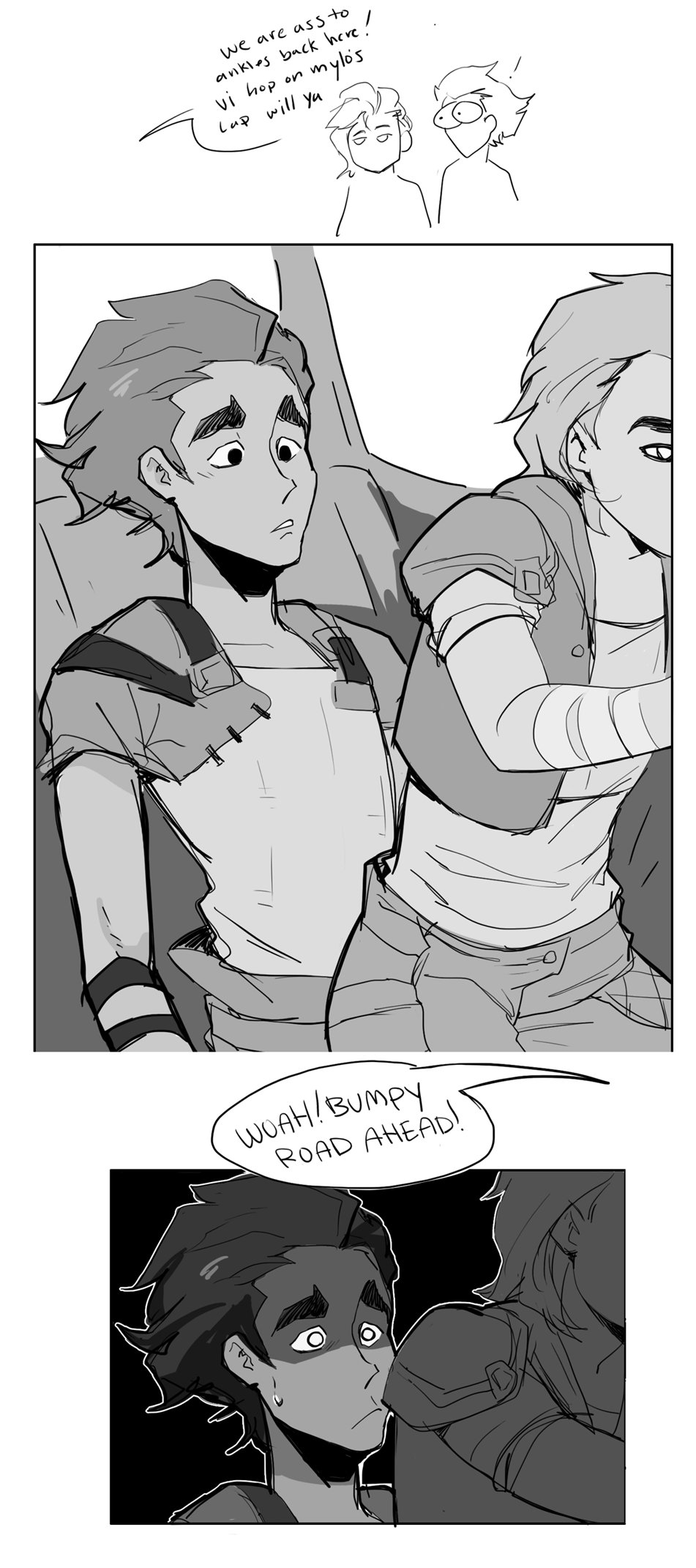 1boy 1girl arcane:_league_of_legends car_interior closed_mouth collarbone english_text highres jacket league_of_legends meme monochrome mooch_(uhmooch) mylo_(arcane) on_lap open_clothes open_jacket pants shirt short_hair short_sleeves sitting speech_bubble sweatdrop teeth vi_(league_of_legends)