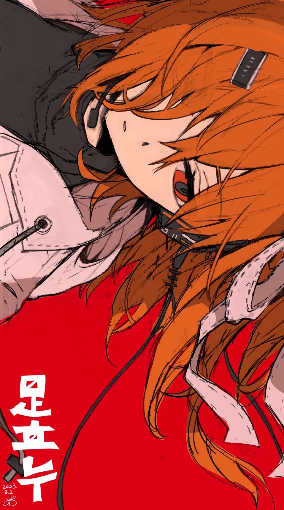 1girl a.i._voice adachi_rei audio_jack black_shirt cable character_name dated empty_eyes expressionless floating_hair hair_ornament hair_ribbon hairclip half-closed_eyes headphones highres jacket microphone ofgwr open_clothes open_jacket orange_eyes orange_hair parted_lips pixelated portrait red_background ribbon shirt sideways sideways_glance signature simple_background solo turtleneck utau white_jacket white_ribbon
