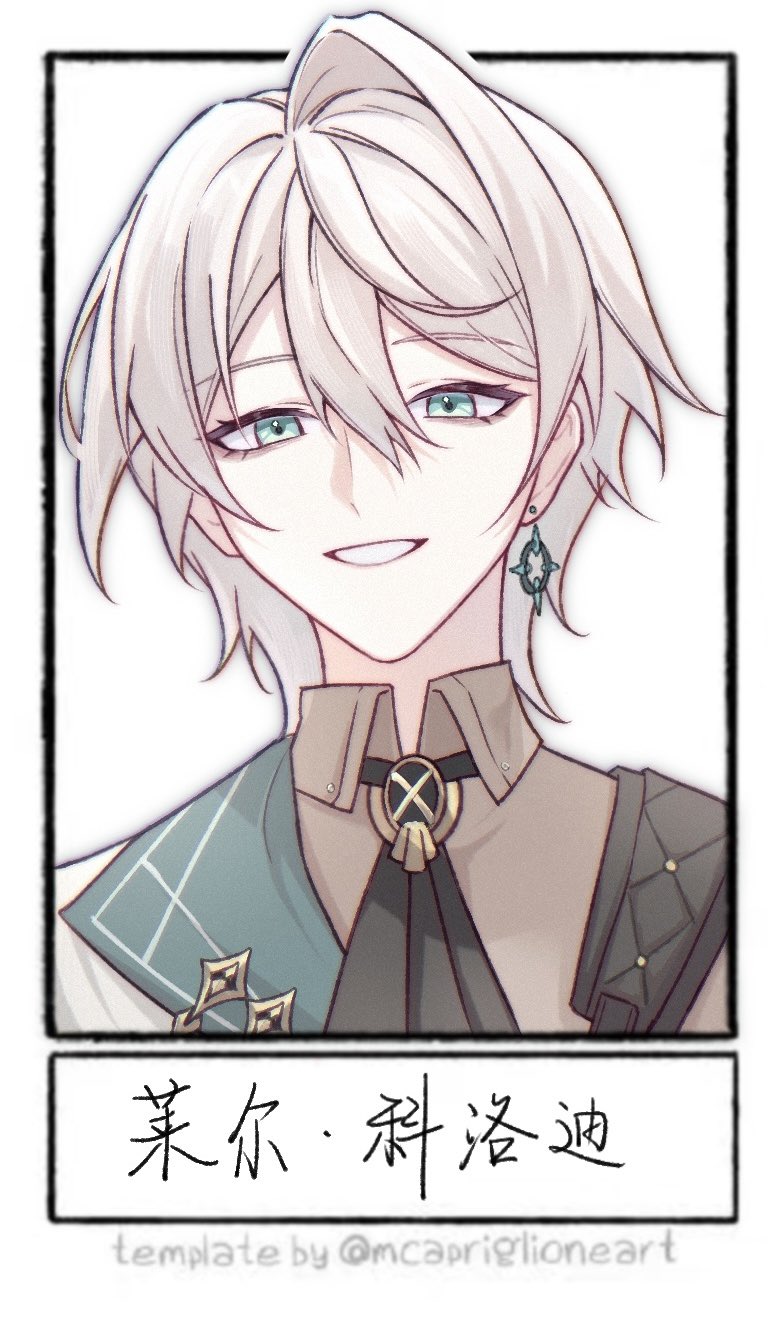 brown_shirt collared_shirt copyright_request earrings green_eyes grey_eyes hair_bun highres jewelry looking_at_viewer napppptt portrait shirt simple_background single_hair_bun smile solo translation_request twitter_username white_background