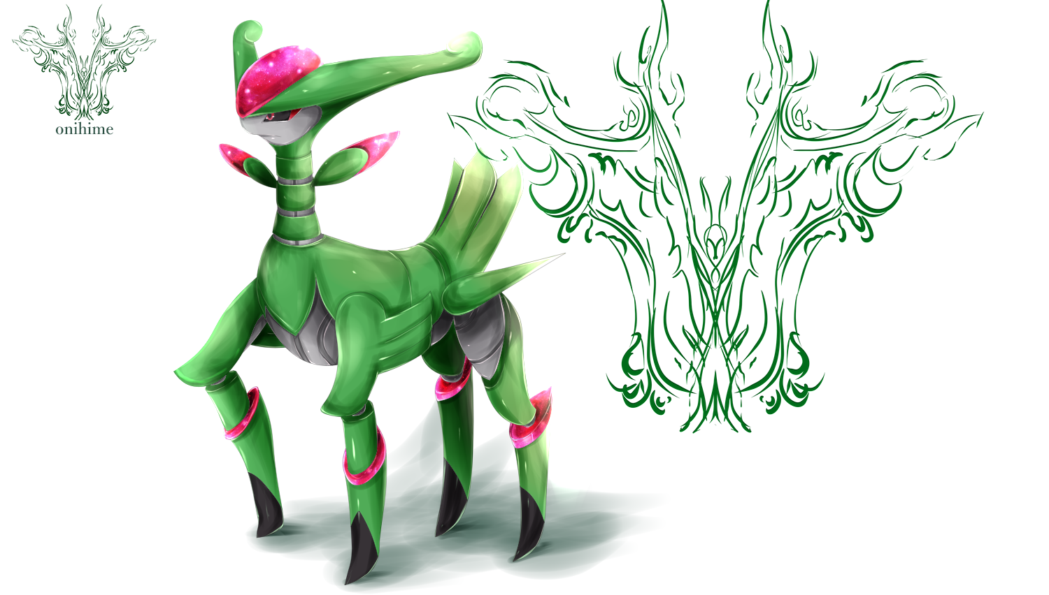 artist_name black_sclera closed_mouth colored_sclera commentary_request full_body iron_leaves nintendo pink_eyes pokemon pokemon_(creature) solo standing super_oniko watermark white_background