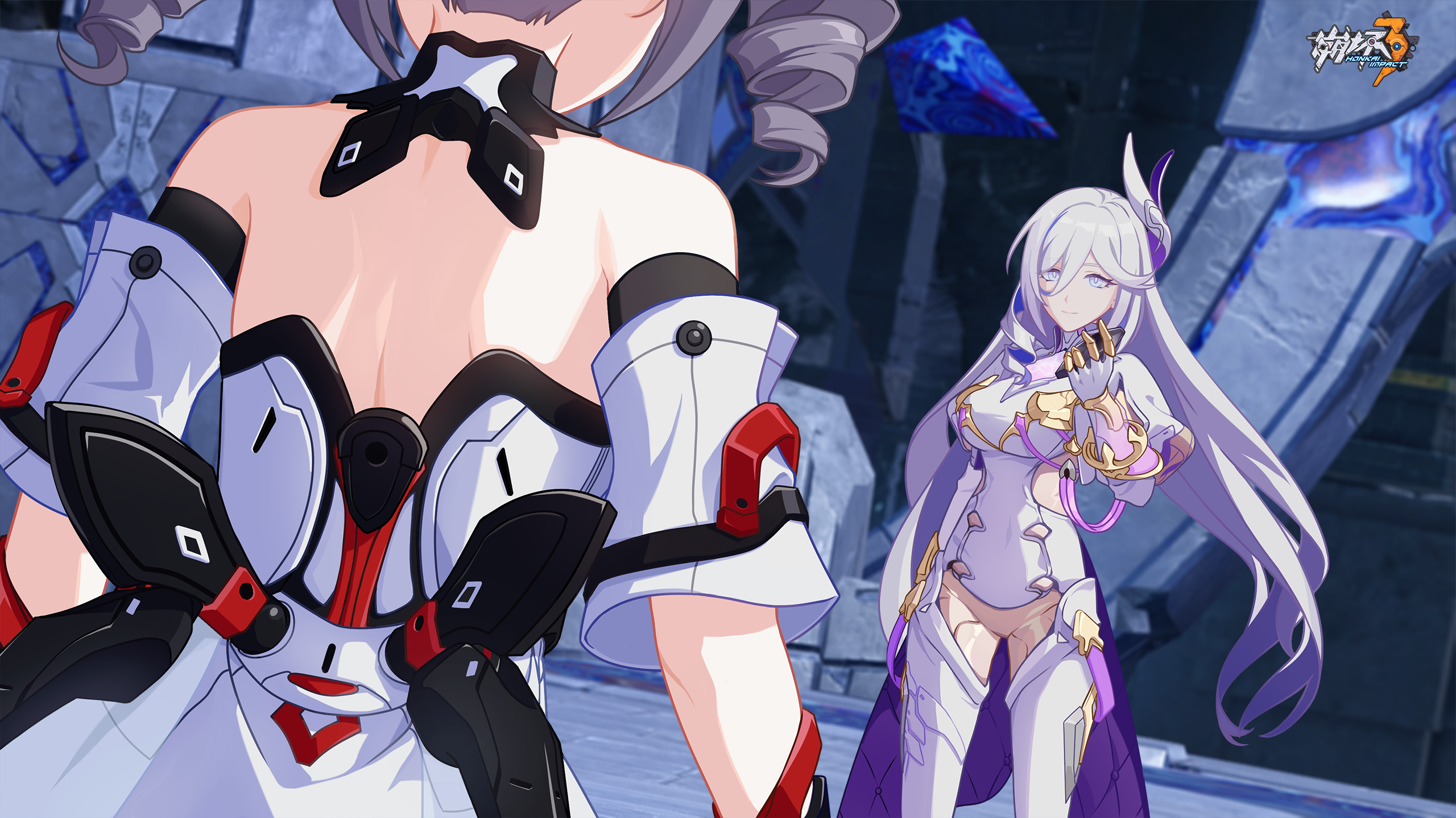 2girls back bare_shoulders bronya_zaychik bronya_zaychik_(drive_kometa) bronya_zaychik_(yamabuki_armor) drill_hair grey_hair misteln_schariac highres holding honkai_(series) honkai_impact_3rd looking_at_another multiple_girls official_alternate_costume official_art official_wallpaper smile solo solo_focus standing upper_body white_hair