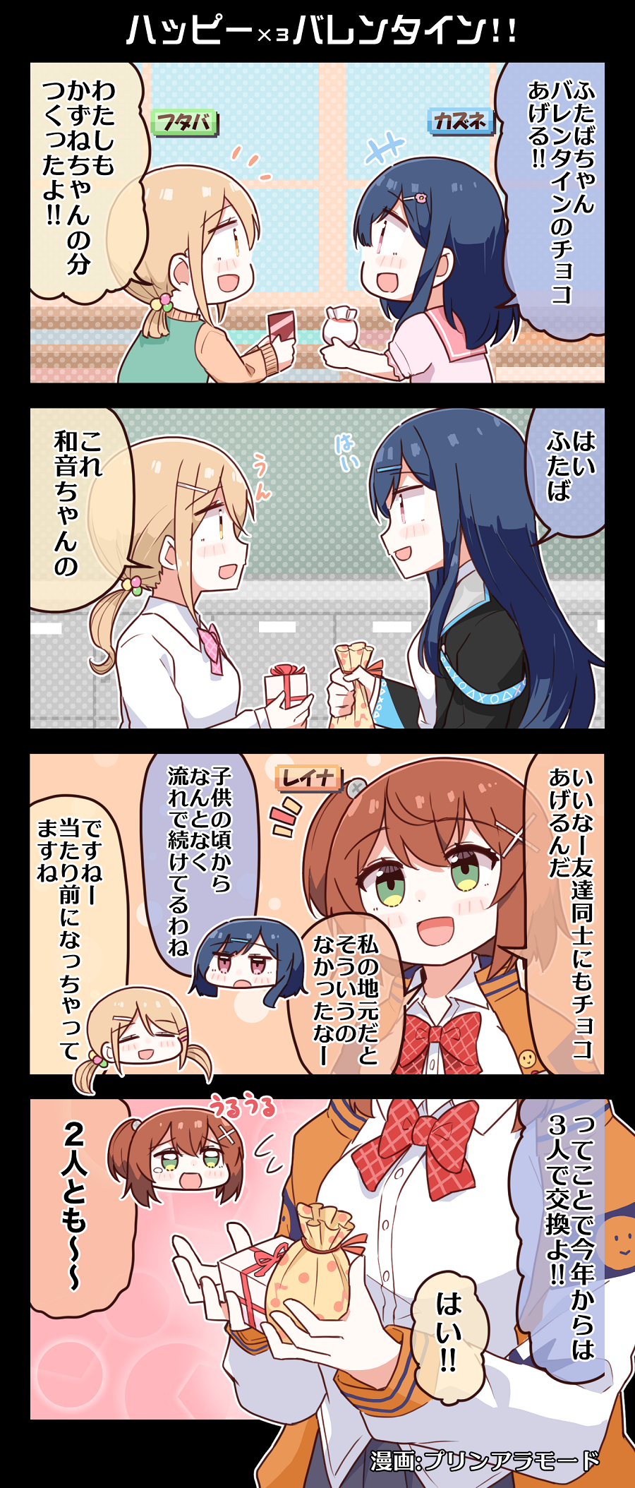 4koma aged_down black_jacket blonde_hair blue_hair blush bow bowtie brown_hair comic denonbu flashback gift green_eyes hair_between_eyes hair_ornament hair_tie hairclip happy_valentine hidaka_reina_(denonbu) highres holding holding_gift indoors jacket kayano_futaba long_hair long_sleeves looking_at_another low_twintails official_alternate_costume open_clothes open_jacket open_mouth orange_jacket purin_a_la_mode_(popup) red_bow red_bowtie red_eyes school_uniform shinonome_kazune shirt side_ponytail smile standing twintails valentine white_shirt x_hair_ornament