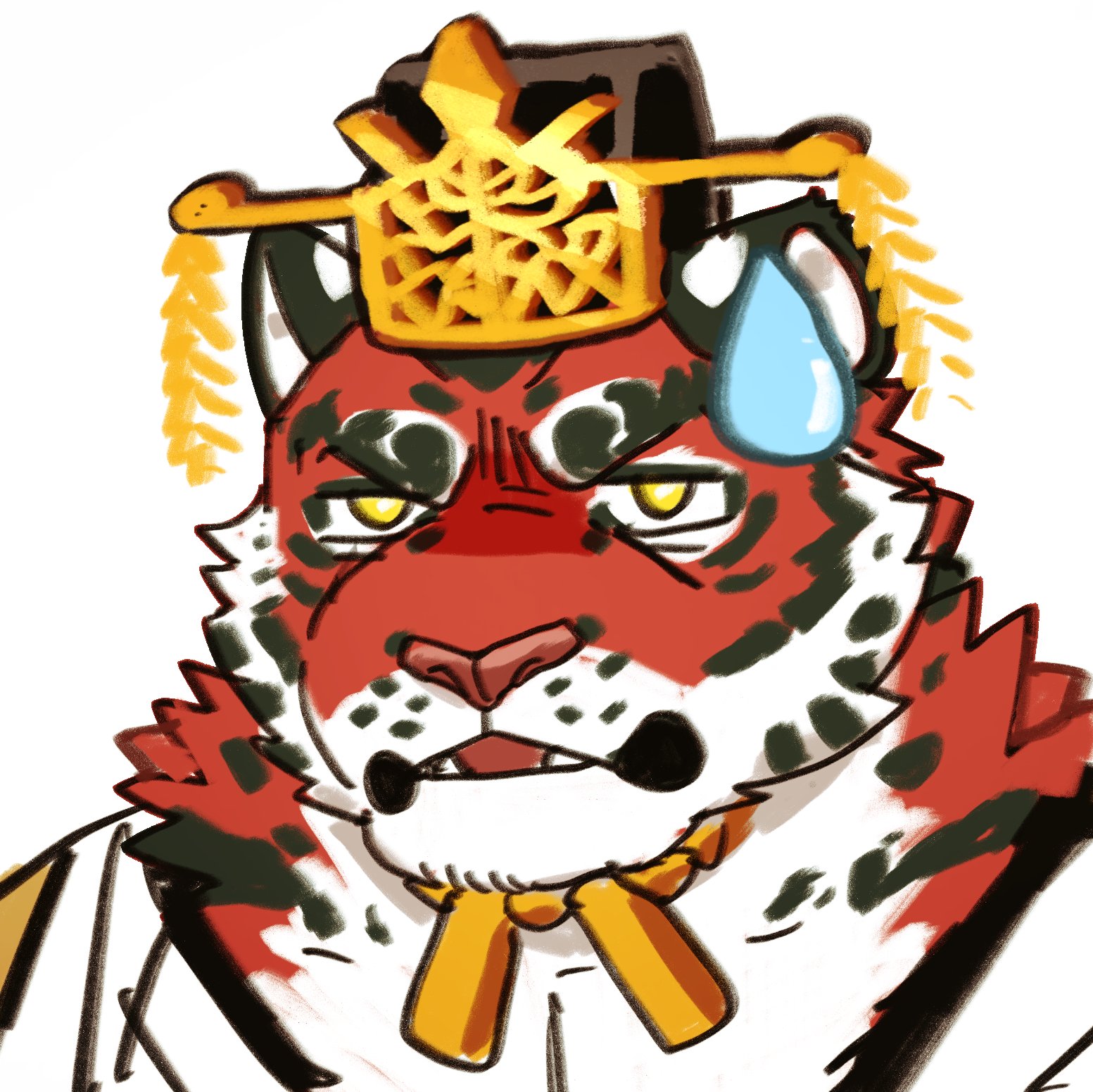 1boy animal_ears bara chibi chinese_clothes crave_saga frown furry furry_male guan_hat highres male_focus mature_male mian_guan mowang_yu orange_fur pectoral_cleavage pectorals solo sweatdrop thick_eyebrows tiger_boy tiger_ears two-tone_fur upper_body yata_no_kagami_(crave_saga)