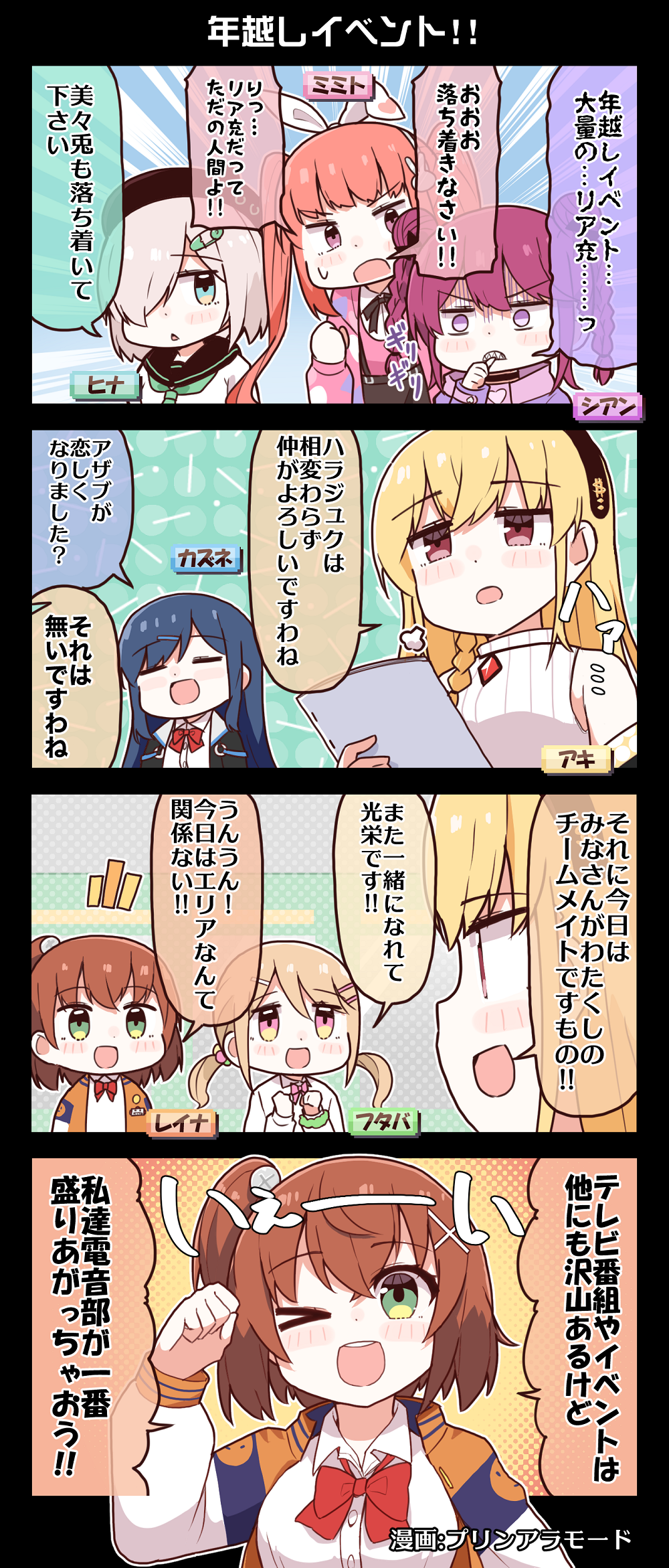 4koma 6+girls animal_ears biting biting_own_thumb black_jacket blonde_hair blue_hair blush braid brown_hair closed_eyes comic denonbu double_bun green_eyes grey_hair hair_between_eyes hair_bun hair_ornament hidaka_reina_(denonbu) highres holding holding_paper hood hoodie inubousaki_shian jacket kayano_futaba long_hair long_sleeves looking_at_another looking_at_viewer minakami_hina multiple_girls official_art one_eye_closed open_clothes open_jacket open_mouth paper pink_hair purin_a_la_mode_(popup) purple_eyes purple_hair purple_hoodie rabbit_ears red_eyes sakurano_mimito school_uniform shinonome_kazune shirokane_aki shirt short_hair smile standing sweatdrop biting_own_thumb twin_braids twintails white_shirt x_hair_ornament